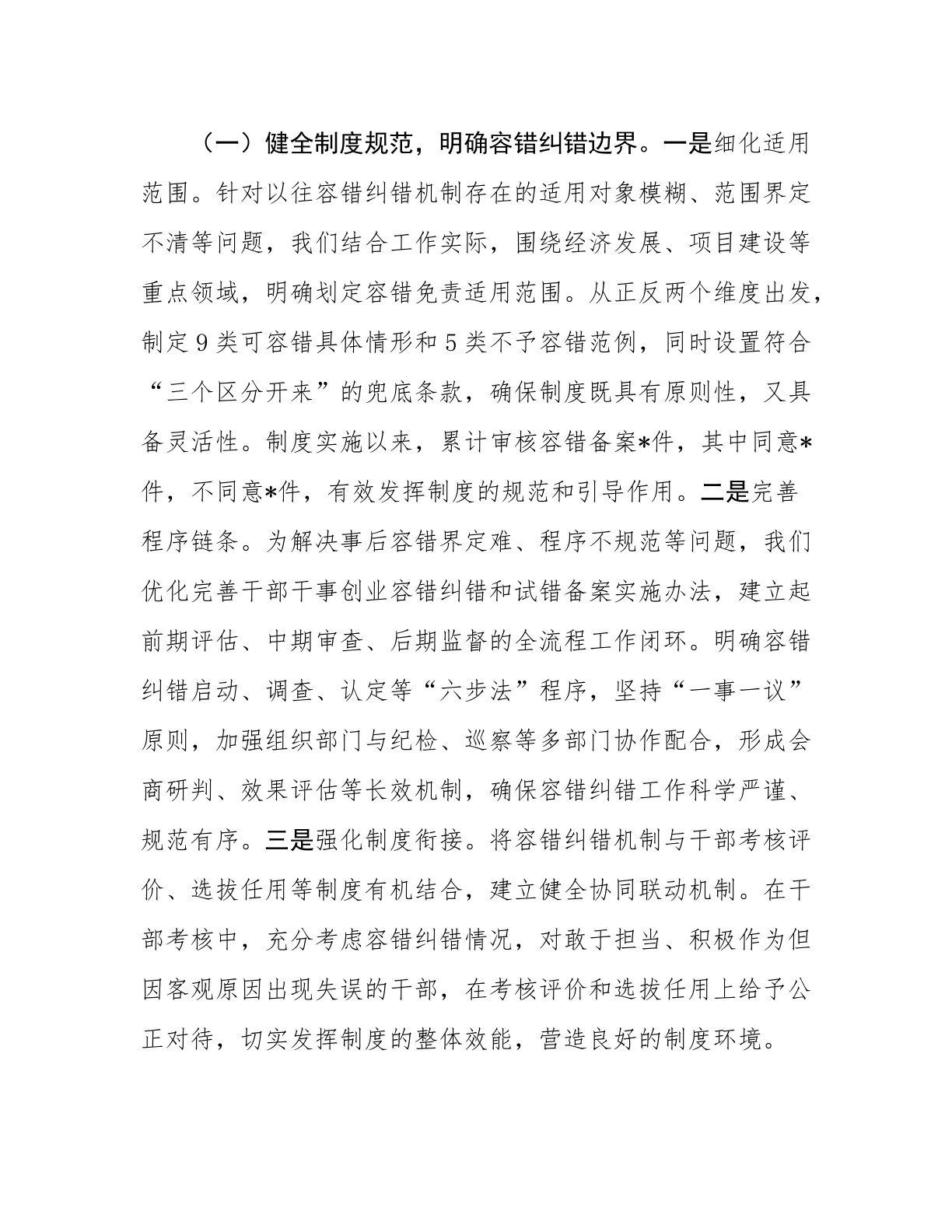 在全省容错纠错机制建设工作经验交流会上的发言材料尊敬的各位领导、同志们:大家好!党的二十届三中全会《决定》明确提出落实“三个区分开来”,为干部担当作为指明方向。全国组织部长会议也强调要将从严管理监督与鼓励担当作为有机统一。近年来,我们*地区深入贯彻会议精神,积极探索容错纠错机制,通过全周期管理模式,实现从被动容错向主动保障的转变,有效激发干部队伍干事创业热情。下面,我结合实际工作,从三个方面汇报交流经验。一、强化制度构建,筑牢干部担当作为制度根基制度建设是推动工作的基础和保障。在落实“三个区分开来”要求过程中,我们深刻认识到,只有建立科学完备的制度体系,才能为干部担当作为提供坚实支撑。为此,我...