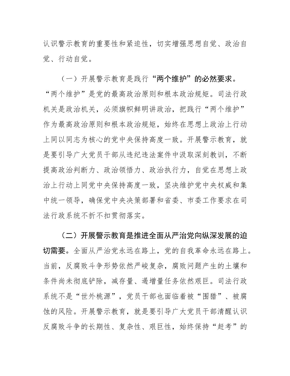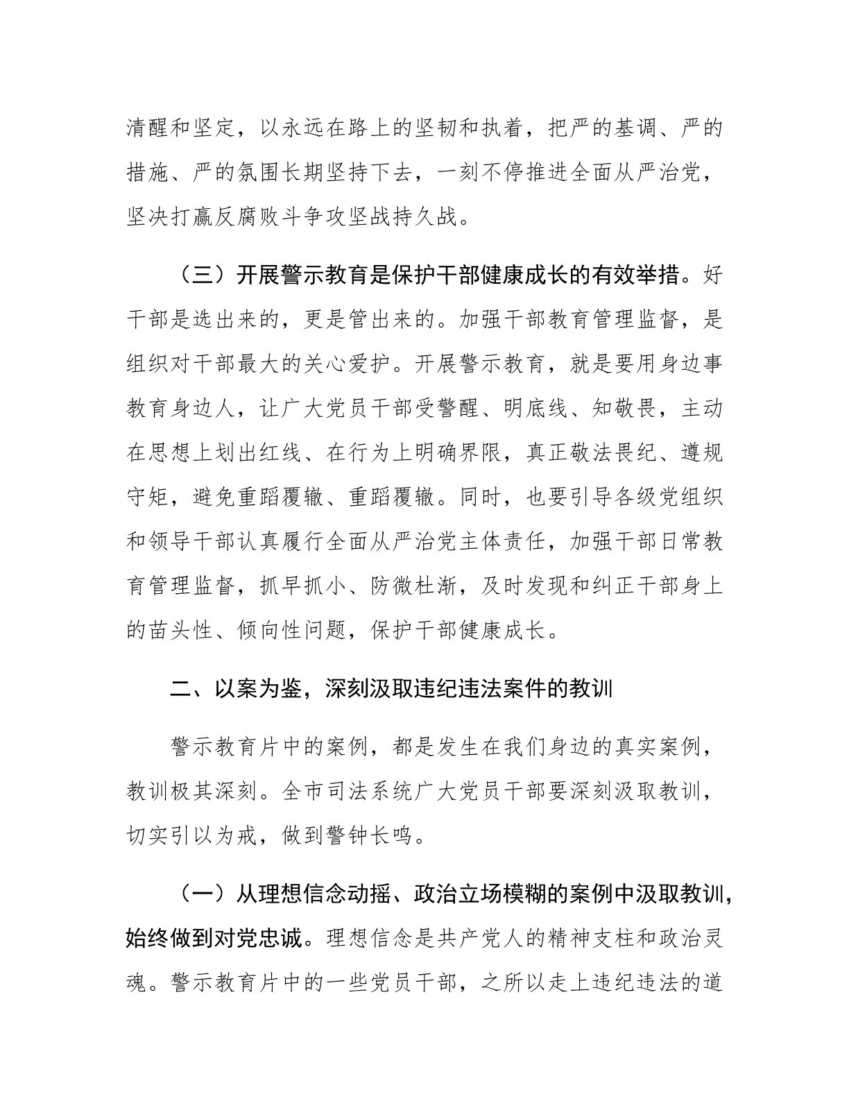 司法局党组书记在全市司法系统2025年度党员干部警示教育大会上的讲话同志们:今天,我们召开全市司法系统2025年度党员干部警示教育大会,主要任务是深入学习贯彻总书记关于全面从严治党的重要论述,认真落实中央、省委、市委关于全面从严治党的部署要求,以案为鉴、以案促改、以案促治,教育引导全市司法系统广大党员干部进一步增强廉洁自律意识,筑牢拒腐防变思想防线,推动全面从严治党向纵深发展,为奋力谱写中国式现代化新篇章提供坚强法治保障。刚才,我们集中观看了警示教育片,片中揭示的违纪违法案例触目惊心、发人深省,给我们上了一堂生动的警示教育课。下面,我讲三个方面意见。一、提高政治站位,深刻认识警示教育的重要性和...