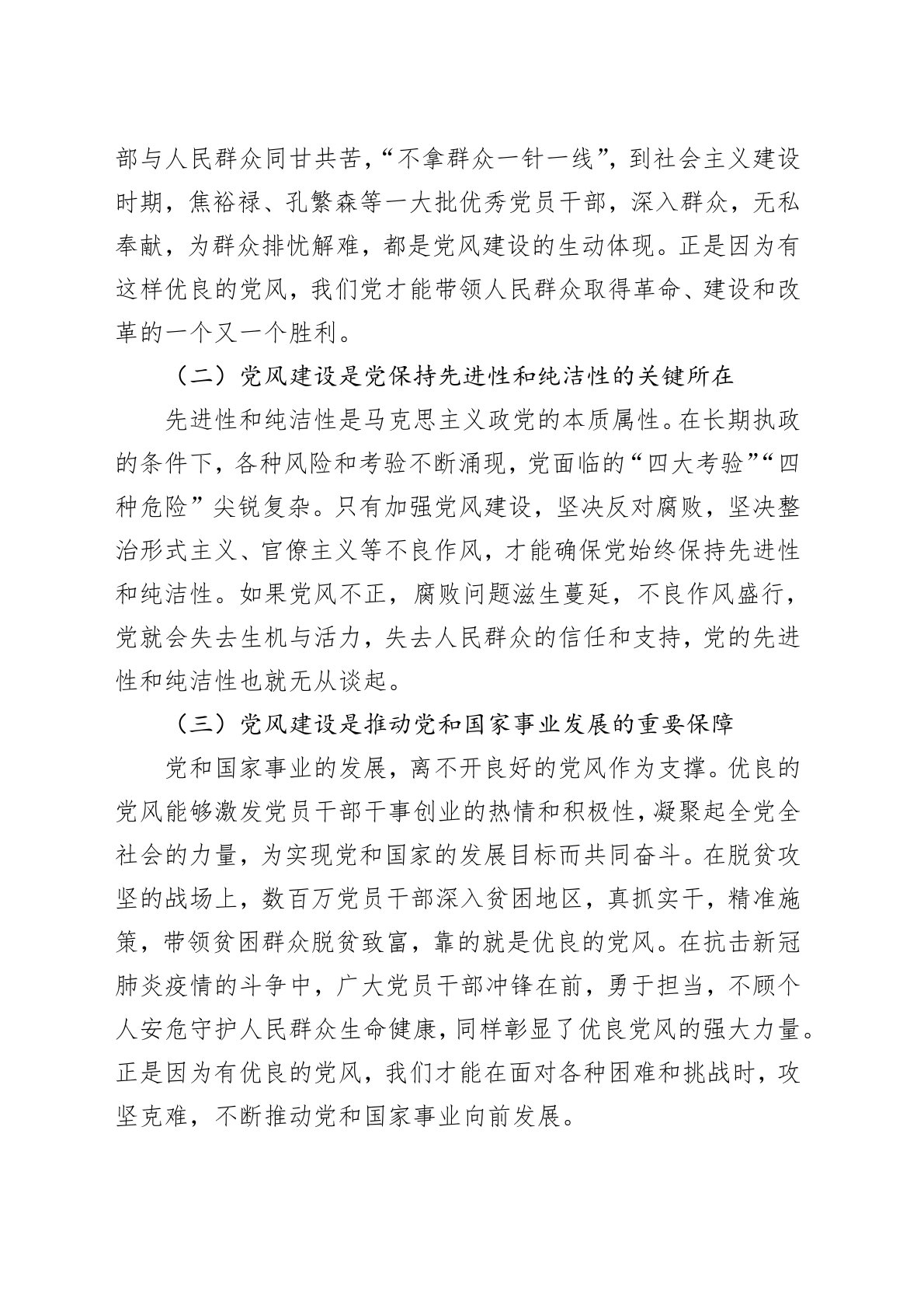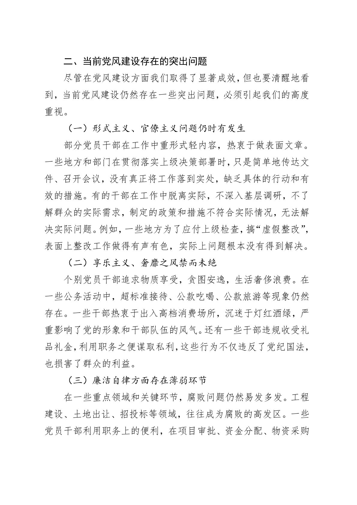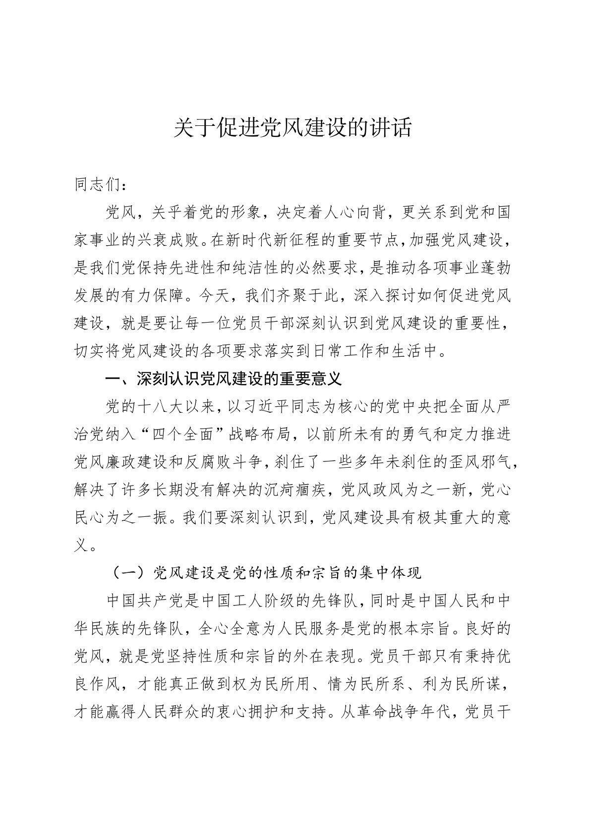 同志们:党风,关乎着党的形象,决定着人心向背,更关系到党和国家事业的兴衰成败。在新时代新征程的重要节点,加强党风建设,是我们党保持先进性和纯洁性的必然要求,是推动各项事业蓬勃发展的有力保障。今天,我们齐聚于此,深入探讨如何促进党风建设,就是要让每一位党员干部深刻认识到党风建设的重要性,切实将党风建设的各项要求落实到日常工作和生活中。一、深刻认识党风建设的重要意义党的十八大以来,以习近平同志为核心的党中央把全面从严治党纳入“四个全面”战略布局,以前所未有的勇气和定力推进党风廉政建设和反腐败斗争,刹住了一些多年未刹住的歪风邪气,解决了许多长期没有解决的沉疴痼疾,党风政风为之一新,党心民心为之一振。...