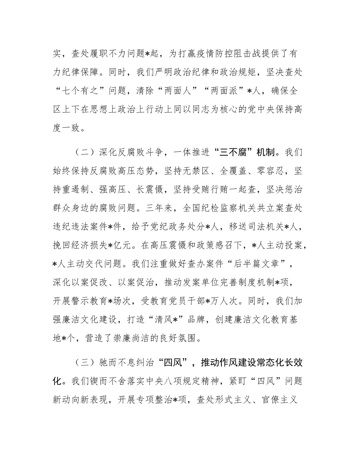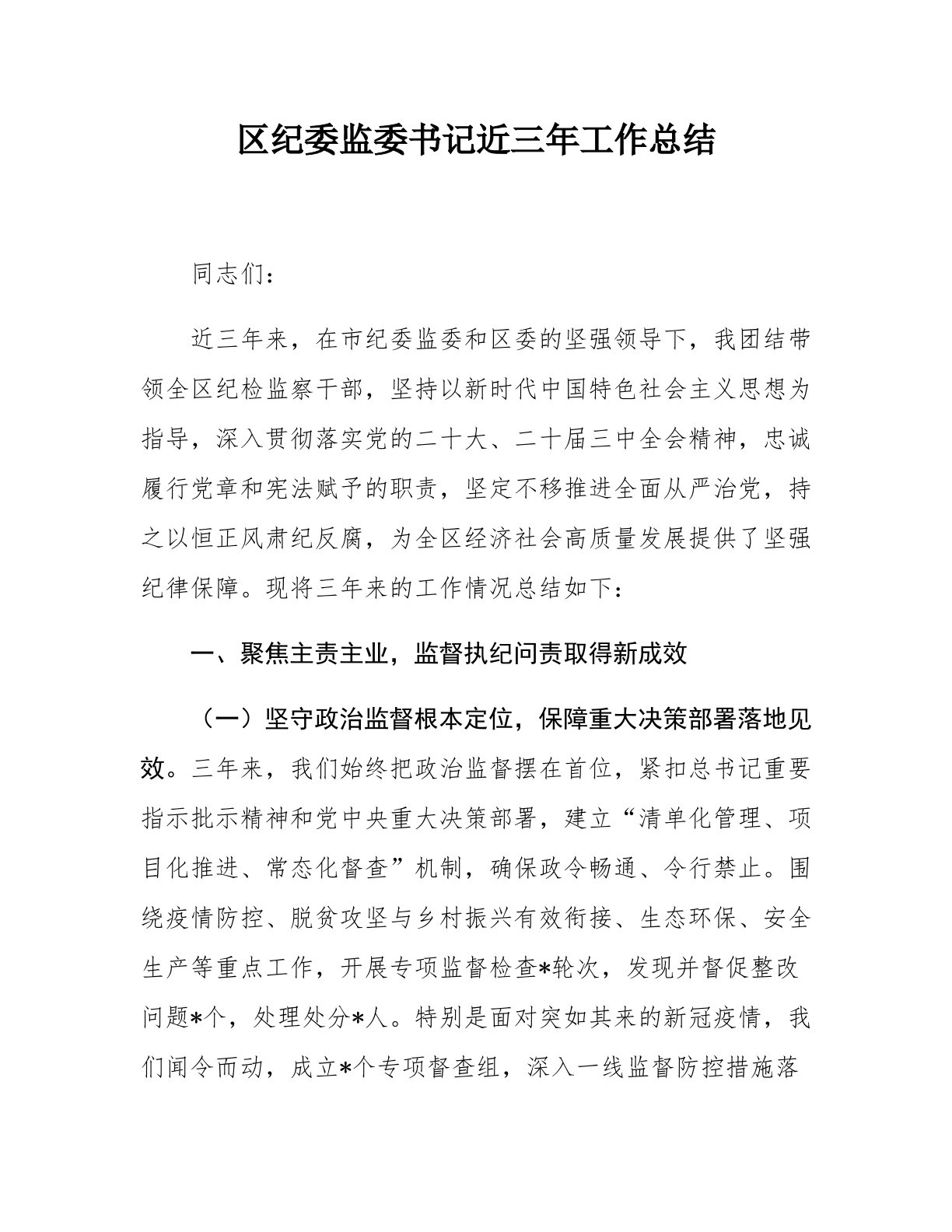 区纪委监委书记近三年工作总结同志们:近三年来,在市纪委监委和区委的坚强领导下,我团结带领全区纪检监察干部,坚持以新时代中国特色社会主义思想为指导,深入贯彻落实党的二十大、二十届三中全会精神,忠诚履行党章和宪法赋予的职责,坚定不移推进全面从严治党,持之以恒正风肃纪反腐,为全区经济社会高质量发展提供了坚强纪律保障。现将三年来的工作情况总结如下:一、聚焦主责主业,监督执纪问责取得新成效(一)坚守政治监督根本定位,保障重大决策部署落地见效。三年来,我们始终把政治监督摆在首位,紧扣总书记重要指示批示精神和党中央重大决策部署,建立“清单化管理、项目化推进、常态化督查”机制,确保政令畅通、令行禁止。围绕疫情...
