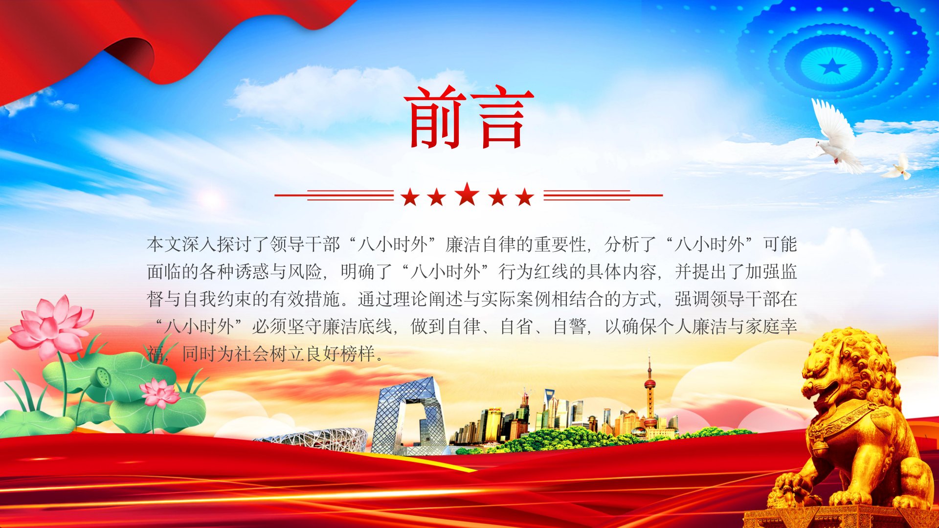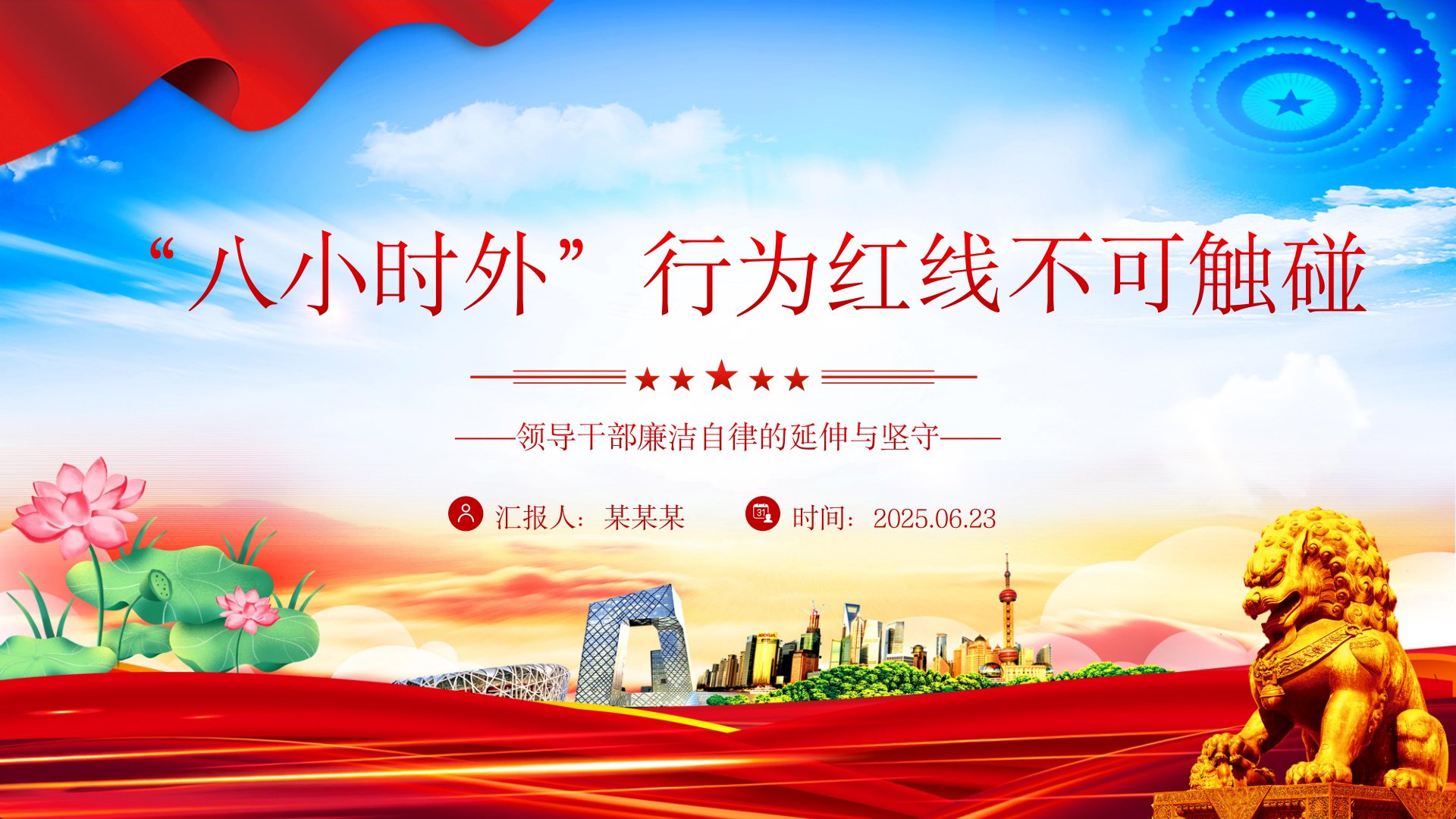 标题:党课PPT课件:“八小时外”行为红线不可触碰,领导干部廉洁自律的延伸与坚守