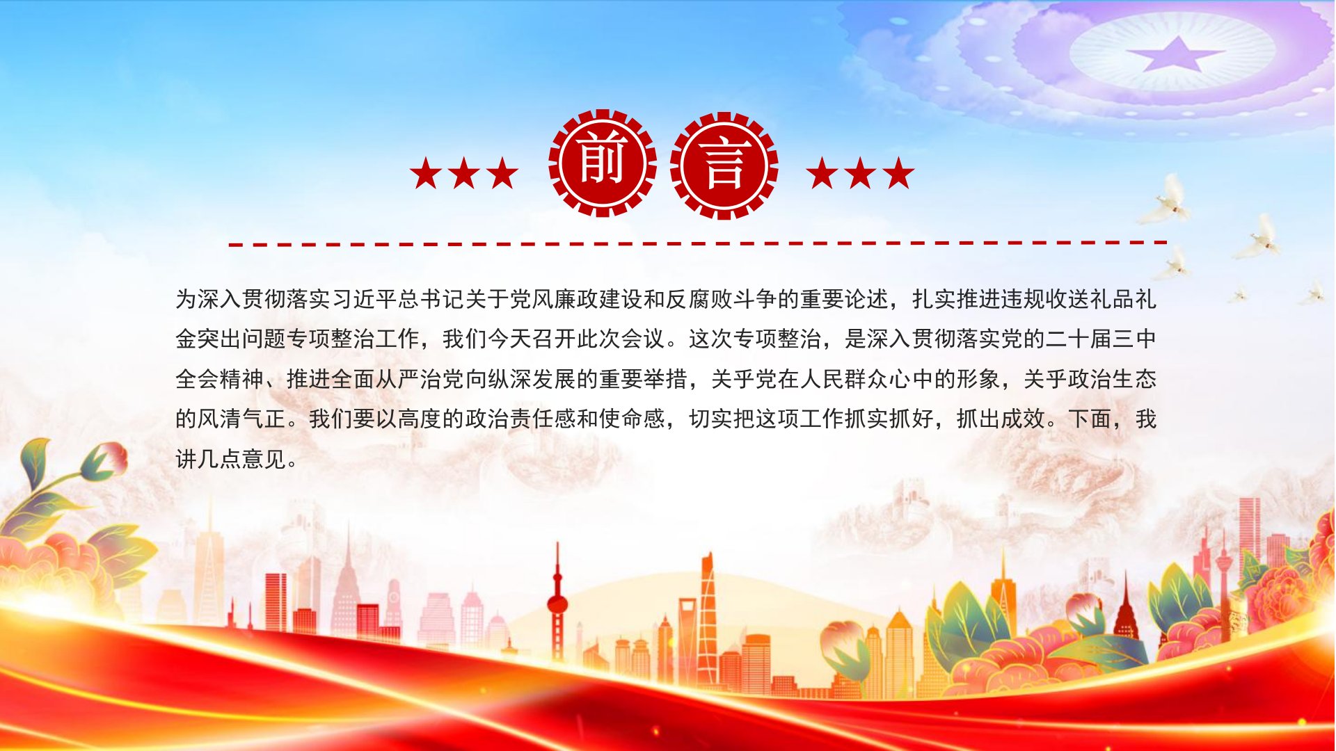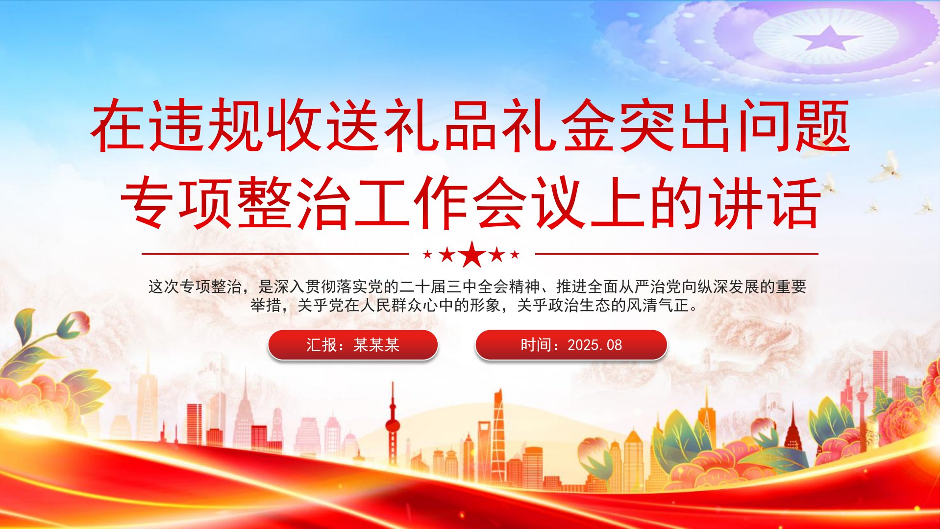 在违规收送礼品礼金突出问题专项整治工作会议上的讲话这次专项整治,是深入贯彻落实党的二十届三中全会精神、推进全面从严治党向纵深发展的重要举措,关乎党在人民群众心中的形象,关乎政治生态的风清气正。为深入贯彻落实习近平总书记关于党风廉政建设和反腐败斗争的重要论述,扎实推进违规收送礼品礼金突出问题专项整治工作,我们今天召开此次会议。这次专项整治,是深入贯彻落实党的二十届三中全会精神、推进全面从严治党向纵深发展的重要举措,关乎党在人民群众心中的形象,关乎政治生态的风清气正。我们要以高度的政治责任感和使命感,切实把这项工作抓实抓好,抓出成效。下面,我讲几点意见。第一章节提升政治站位,在思想认识上“绷紧弦”...