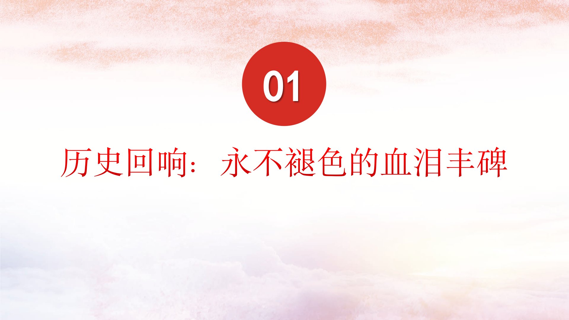 传承伟大抗战精神,开创和平发展未来——纪念反法西斯战争胜利80周年专题党课授课辅导——目录CONTENT历史回响:永不褪色的血泪丰碑历史回响:永不褪色的血泪丰碑1945年9月2日,东京湾密苏里号战舰上,日本签署无条件投降书,那一刻,中国以3500万军民伤亡、4200万难民无家可归的代价,换来了近代以来反侵略战争的首次完全胜利。从1931年“九一八”事变的第一声枪响,到1945年胜利的欢呼声,14年浴血奋战,中国战场牵制了日本陆军70%以上的兵力,粉碎了“三个月灭亡中国”的狂言。北京密云古北口长城上“大好河山,寸土不让”的刻痕,云南腾冲国殇墓园9168块墓碑上斑驳的姓名,都是这段历史最沉重的注脚...