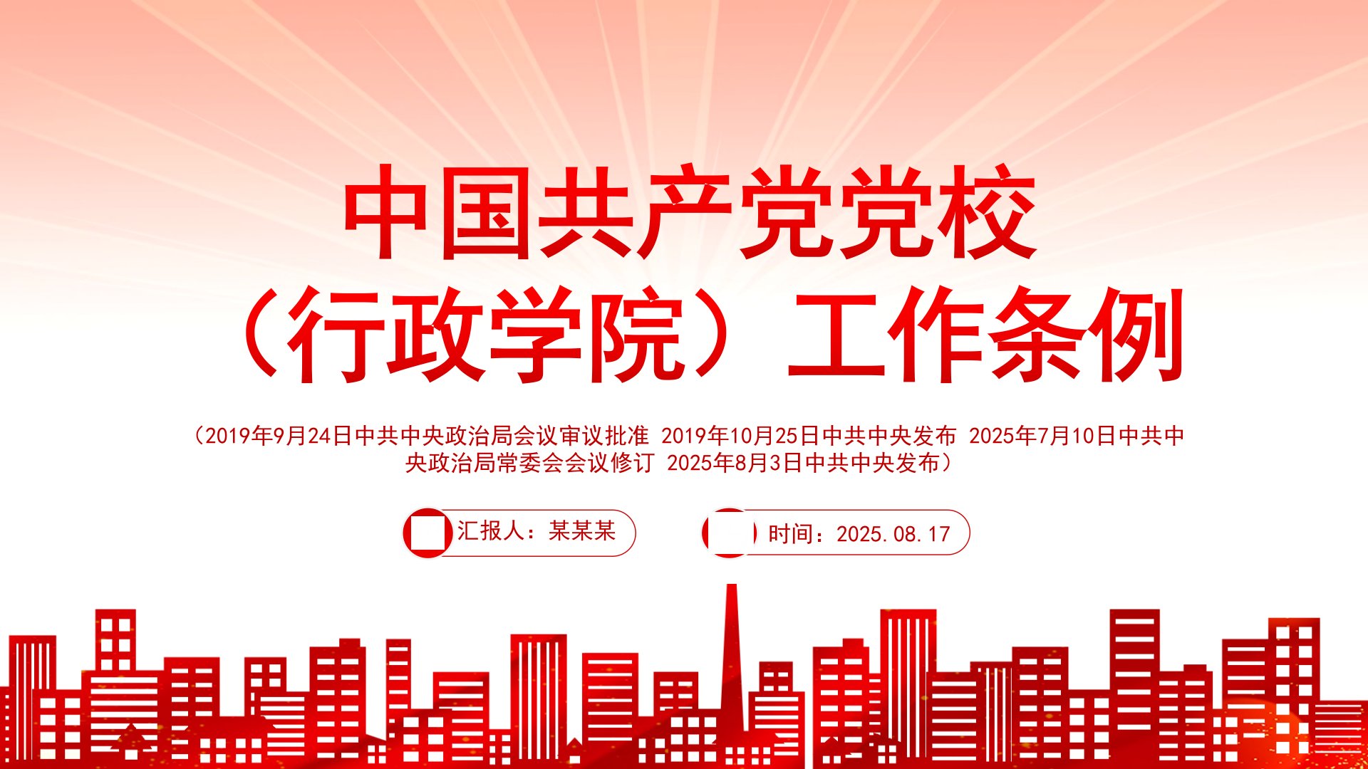 中国共产党党校(行政学院)工作条例(2019年9月24日中共中央政治局会议审议批准 2019年10月25日中共中央发布 2025年7月10日中共中央政治局常委会会议修订 2025年8月3日中共中央发布)总则总则第一条为了坚持和加强党对党校(行政学院)工作的全面领导,提高新时代党校(行政学院)工作科学化、制度化、规范化水平,根据《中国共产党章程》,制定本条例。第二条党校(行政学院)是党领导的培养党的领导干部的学校,是党委的重要部门,是教育培训干部和党员的主渠道,是党的思想理论建设的重要阵地,是党和国家的哲学社会科学研究机构和重要智库。总则第三条党校(行政学院)工作必须高举中国特色社会主义伟大旗帜...