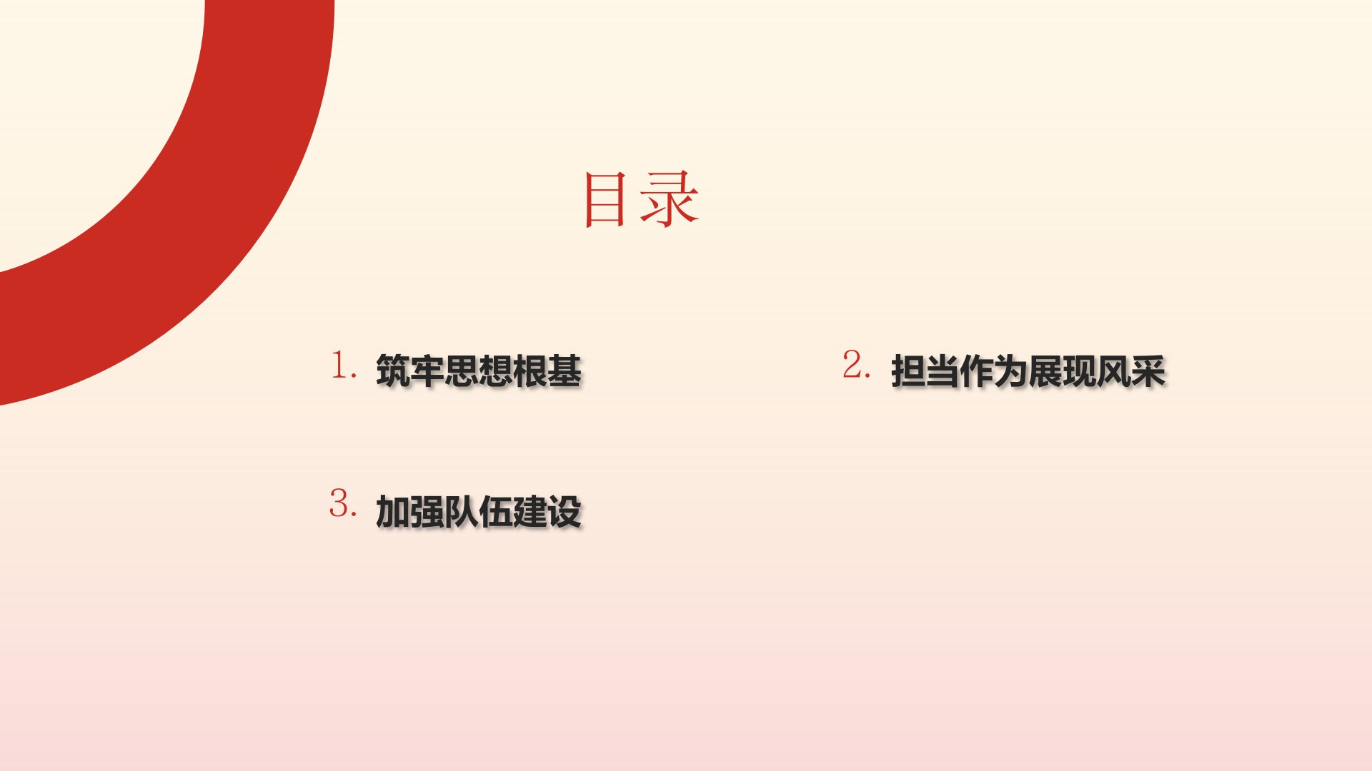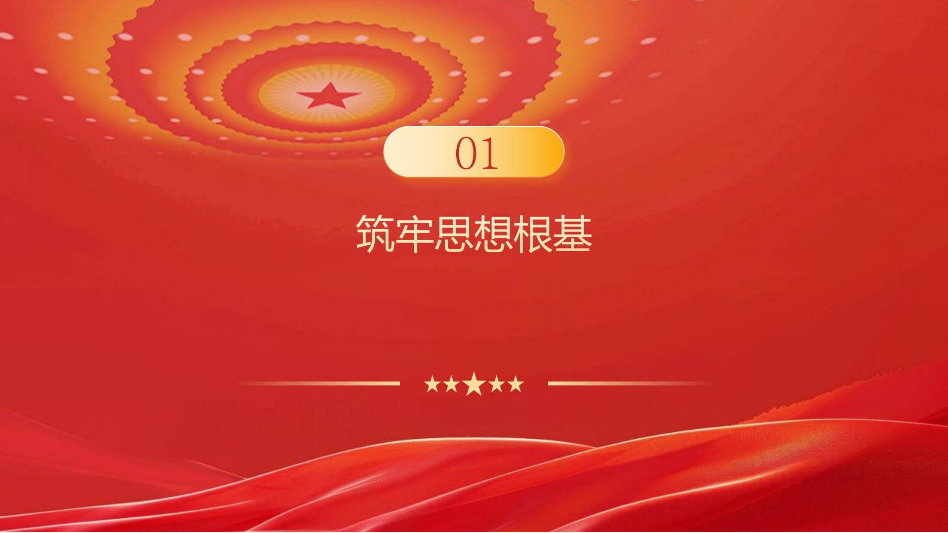 全局党员干部专题党课主讲人:习近平2025.7筑牢法治根基践行司法为民目录担当作为展现风采2.1.筑牢思想根基加强队伍建设3.01筑牢思想根基党的领导是社会主义法治最根本的保证,是司法行政工作的“根”与“魂”,贯穿于我国法治建设的全过程,必须把讲政治摆在首位,深刻领悟“两个确立”的决定性意义,增强“四个意识”、坚定“四个自信”、做到“两个维护”。”党的领导是法治根基要健全完善党领导司法行政工作的制度机制,严格执行重大事项请示报告制度,确保党始终总揽全局、协调各方,使党的路线方针政策和上级党委的决策部署在全市司法行政系统不折不扣地贯彻执行。”完善领导制度机制坚持党的绝对领导站稳人民立场我们党的根...