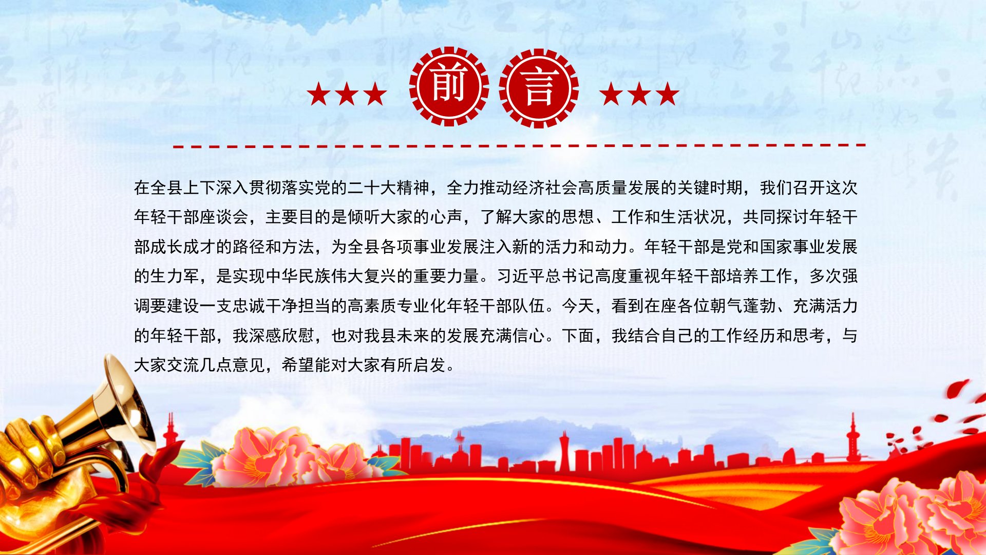 年轻干部座谈会发言讲话在全县上下深入贯彻落实党的二十大精神,全力推动经济社会高质量发展的关键时期,我们召开这次年轻干部座谈会,主要目的是倾听大家的心声,了解大家的思想、工作和生活状况,共同探讨年轻干部成长成才的路径和方法,为全县各项事业发展注入新的活力和动力。年轻干部是党和国家事业发展的生力军,是实现中华民族伟大复兴的重要力量。习近平总书记高度重视年轻干部培养工作,多次强调要建设一支忠诚干净担当的高素质专业化年轻干部队伍。今天,看到在座各位朝气蓬勃、充满活力的年轻干部,我深感欣慰,也对我县未来的发展充满信心。下面,我结合自己的工作经历和思考,与大家交流几点意见,希望能对大家有所启发。第一章节坚...