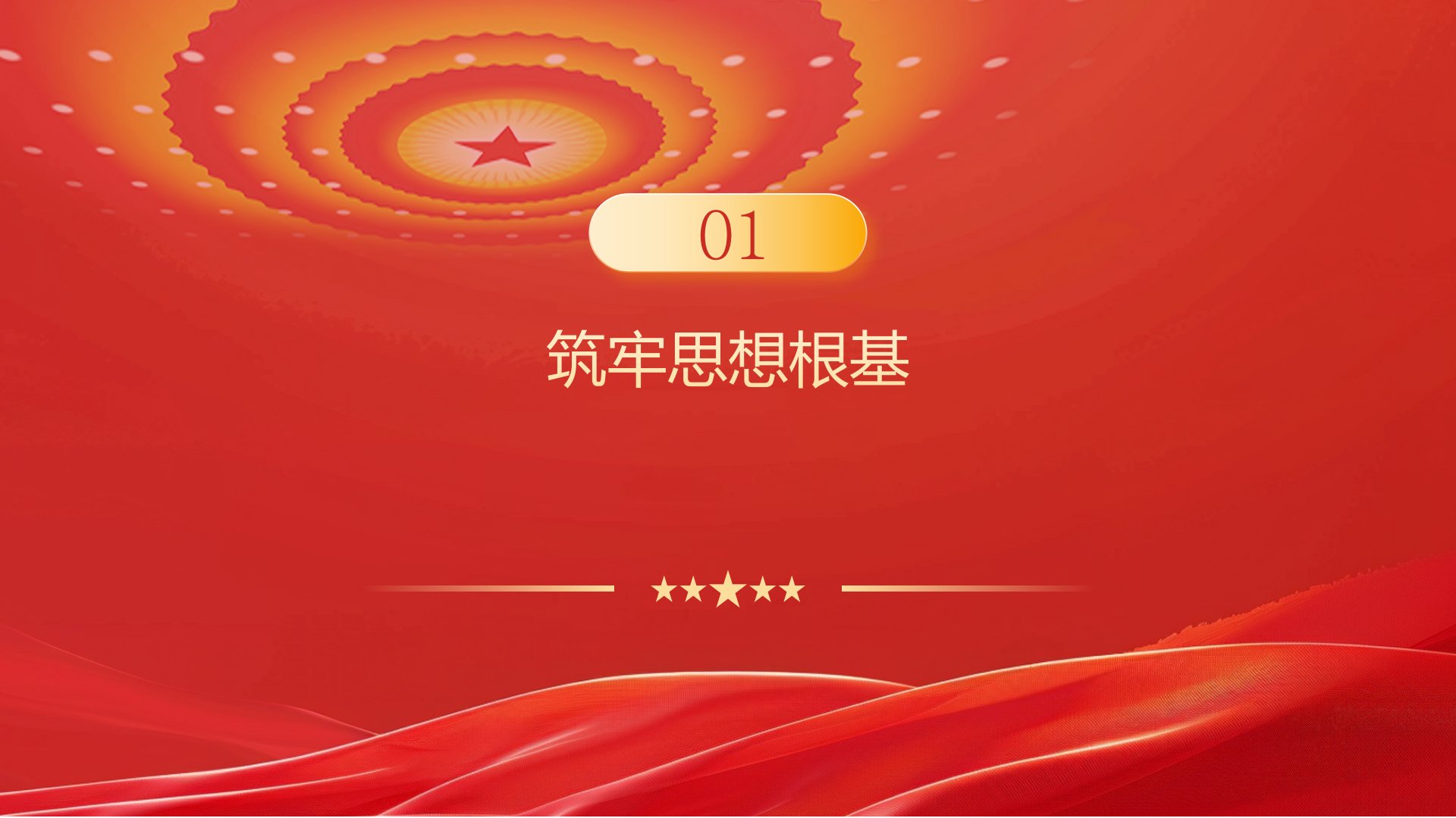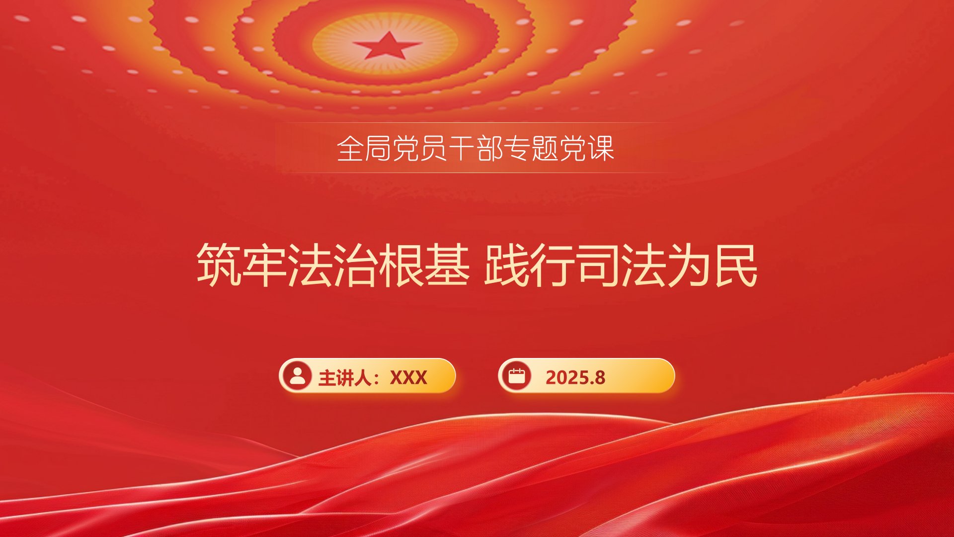 全局党员干部专题党课主讲人:习近平2025.8筑牢法治根基践行司法为民目录担当作为展现风采2.1.筑牢思想根基加强队伍建设3.01筑牢思想根基党的领导是社会主义法治最根本的保证,是司法行政工作的“根”与“魂”,贯穿于我国法治建设的全过程,必须把讲政治摆在首位,深刻领悟“两个确立”的决定性意义,增强“四个意识”、坚定“四个自信”、做到“两个维护”。”党的领导是法治根基要健全完善党领导司法行政工作的制度机制,严格执行重大事项请示报告制度,确保党始终总揽全局、协调各方,使党的路线方针政策和上级党委的决策部署在全市司法行政系统不折不扣地贯彻执行。”完善领导制度机制坚持党的绝对领导站稳人民立场我们党的根...