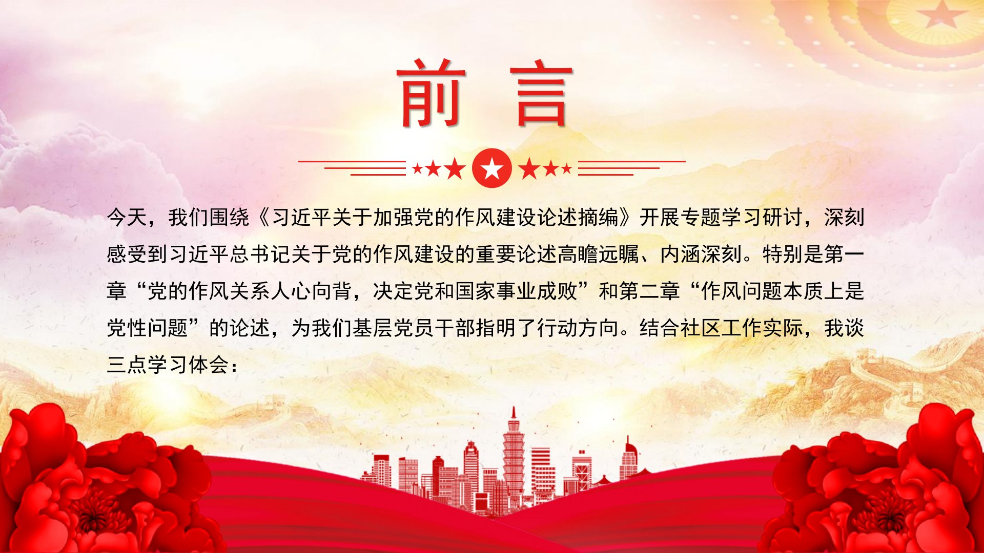 不忘初心党政党建工作汇报认真学习、贯彻和领会上级各项方针、政策、法规;维护党的团结和统一,对党忠诚老实,言行一致;密切联系群众,向群众宣传党的主张,遇事同群众商量以优良作风筑牢基层堡垒用心用情服务人民群众学习《习近平关于加强党的作风建设论述摘编》研讨发言材料不忘初心党政党建工作汇报认真学习、贯彻和领会上级各项方针、政策、法规;维护党的团结和统一,对党忠诚老实,言行一致;密切联系群众,向群众宣传党的主张,遇事同群众商量前言今天,我们围绕《习近平关于加强党的作风建设论述摘编》开展专题学习研讨,深刻感受到习近平总书记关于党的作风建设的重要论述高瞻远瞩、内涵深刻。特别是第一章“党的作风关系人心向背,决...