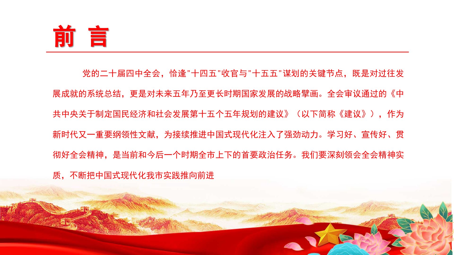 汇报人:习近平深刻学习领会二十届四中全会精神,不断把中国式现代化我市实践推向前进前言党的二十届四中全会,恰逢"十四五"收官与"十五五"谋划的关键节点,既是对过往发展成就的系统总结,更是对未来五年乃至更长时期国家发展的战略擘画。全会审议通过的《中共中央关于制定国民经济和社会发展第十五个五年规划的建议》(以下简称《建议》),作为新时代又一重要纲领性文献,为接续推进中国式现代化注入了强劲动力。学习好、宣传好、贯彻好全会精神,是当前和今后一个时期全市上下的首要政治任务。我们要深刻领会全会精神实质,不断把中国式现代化我市实践推向前进目录CONTENTS一、深刻领会党的二十届四中全会精神实质二、以全会精神...