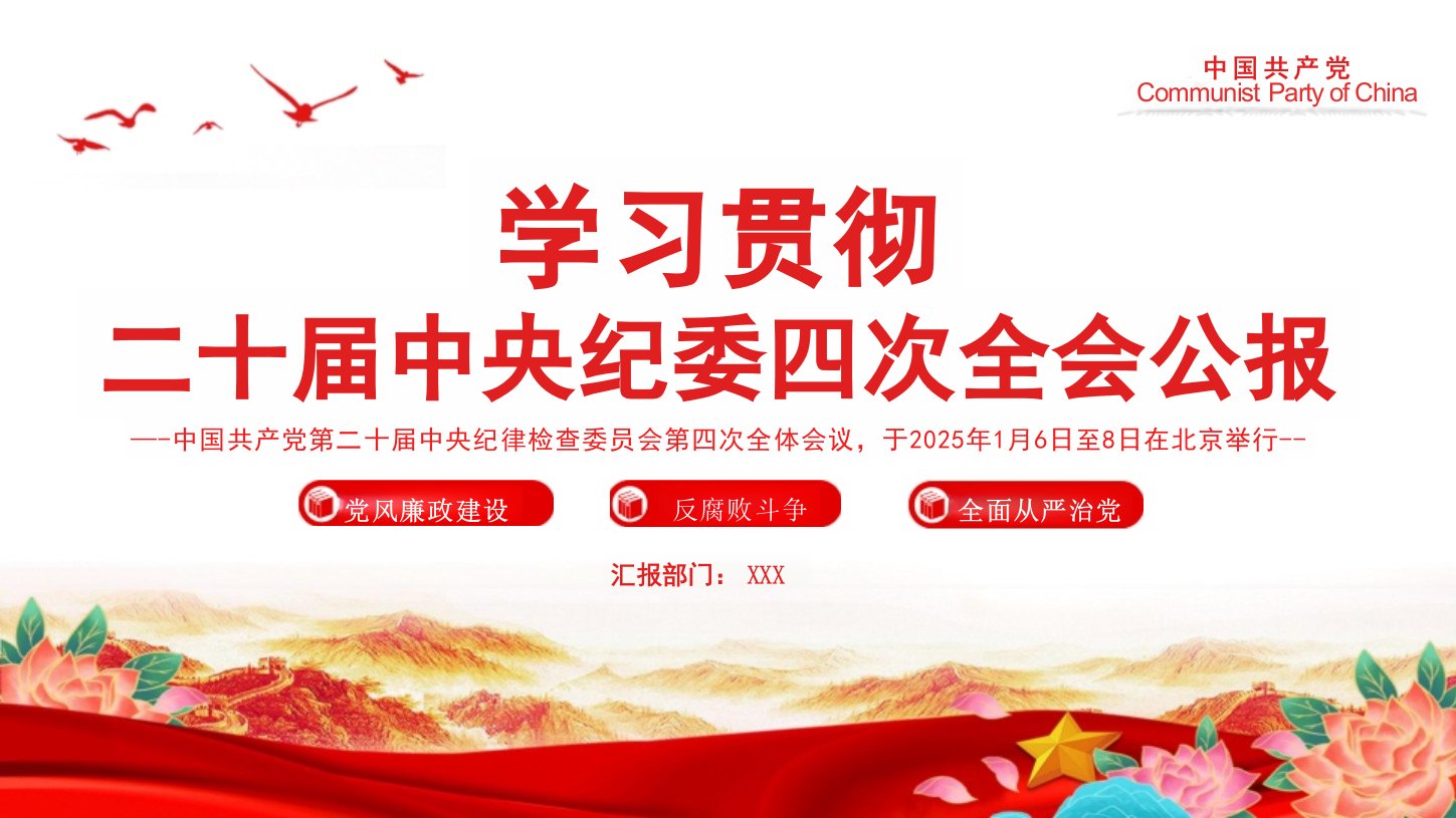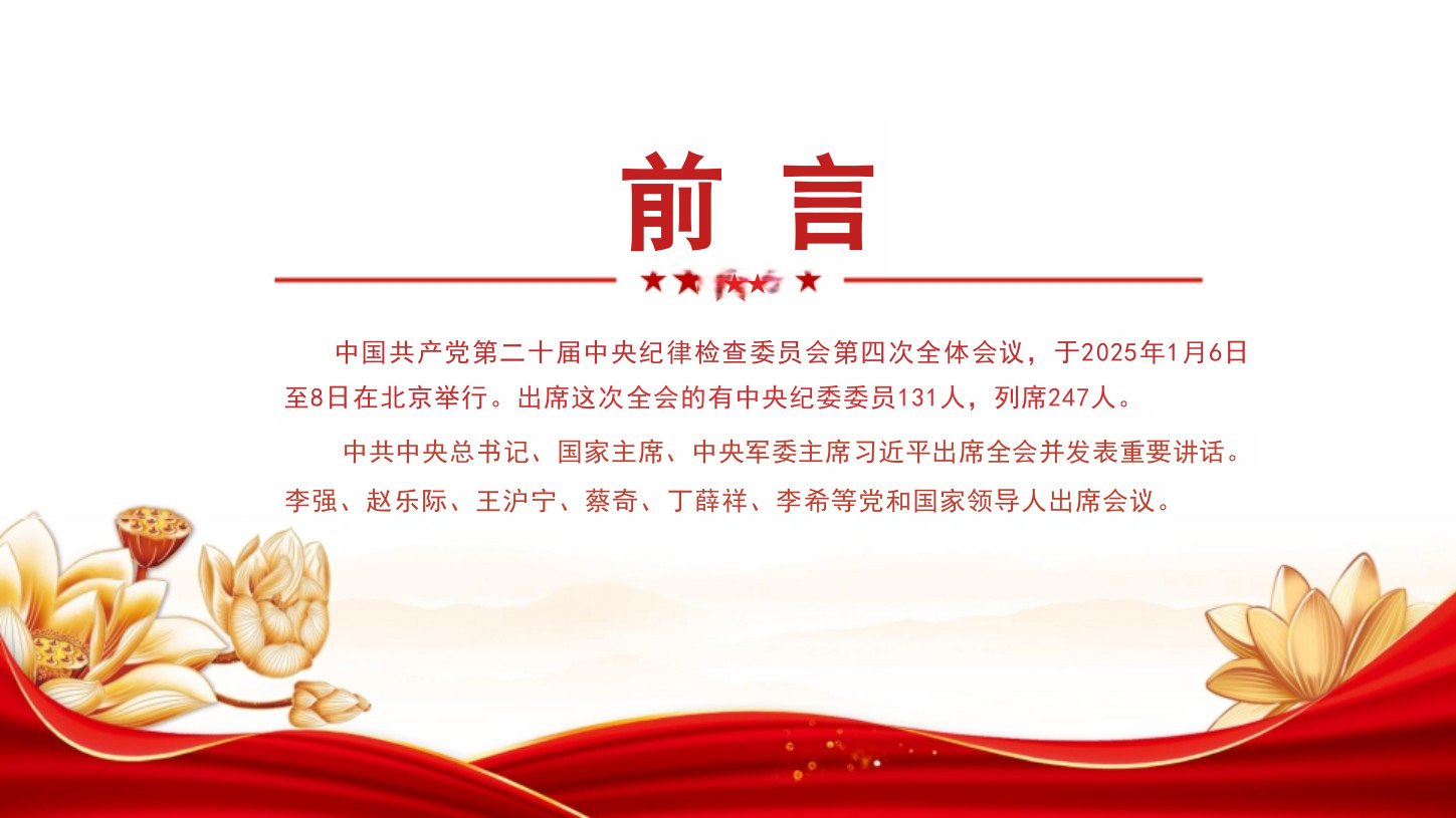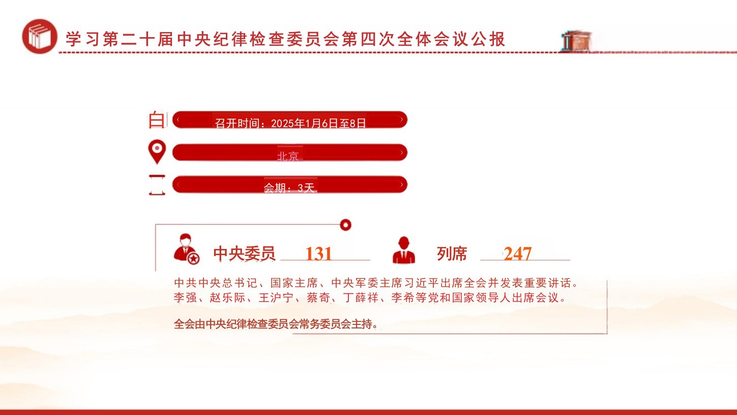 中国共产党学习贯彻二十届中央纪委四次全会公报—-中国共产党第二十届中央纪律检查委员会第四次全体会议,于2025年1月6日至8日在北京举行--党风廉政建设反腐败斗争全面从严治党汇报部门:习近平CommunistPartyofChina前言★★中国共产党第二十届中央纪律检查委员会第四次全体会议,于2025年1月6日至8日在北京举行。出席这次全会的有中央纪委委员131人,列席247人。中共中央总书记、国家主席、中央军委主席习近平出席全会并发表重要讲话。李强、赵乐际、王沪宁、蔡奇、丁薛祥、李希等党和国家领导人出席会议。学习第二十届中央纪律检查委员会第四次全体会议公报血血Ⅲ白召开时间:2025年1月6日...