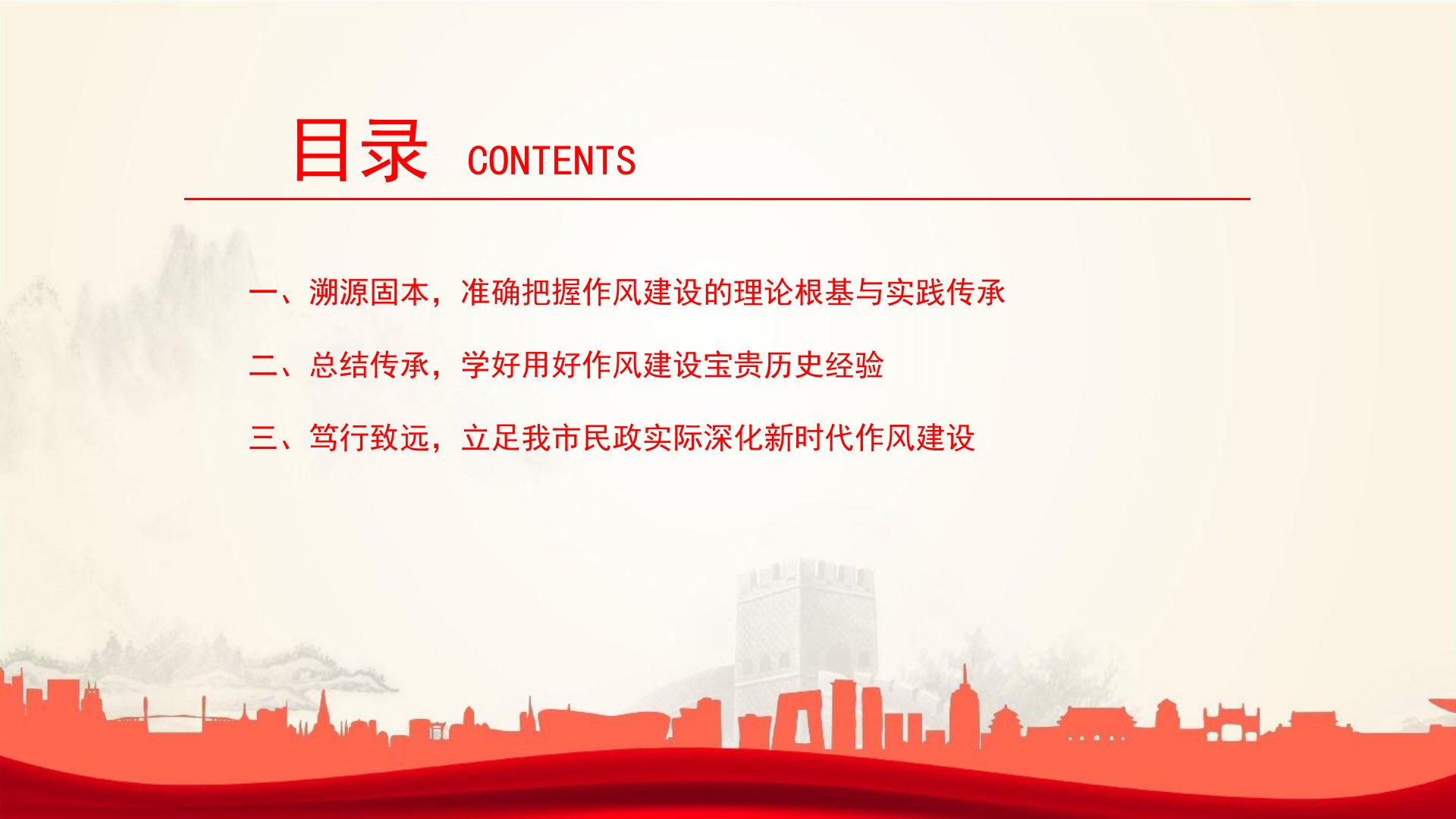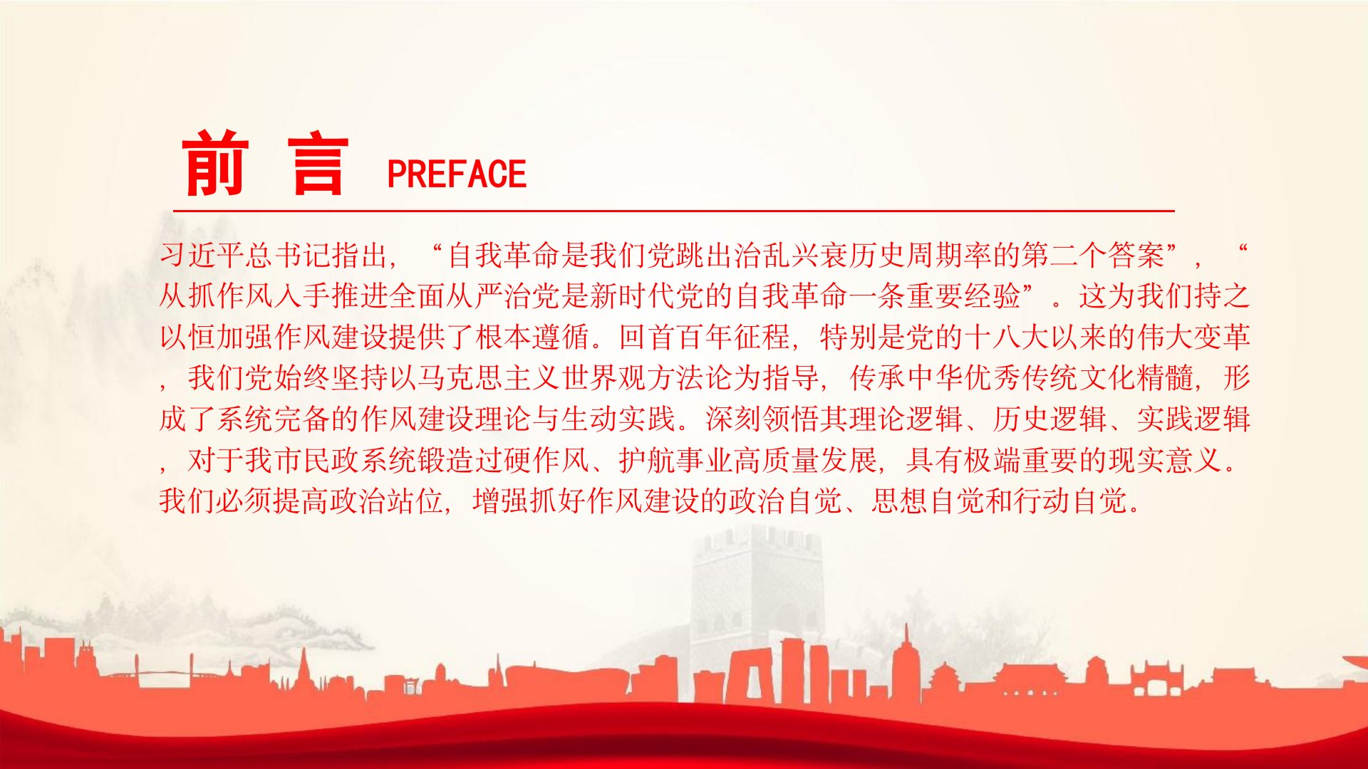 锲而不舍加强党的作风建设,为民政事业高质量发展提供坚强的作风保障授课人:习近平前言PREFACE习近平总书记指出,“自我革命是我们党跳出治乱兴衰历史周期率的第二个答案”,“从抓作风入手推进全面从严治党是新时代党的自我革命一条重要经验”。这为我们持之以恒加强作风建设提供了根本遵循。回首百年征程,特别是党的十八大以来的伟大变革,我们党始终坚持以马克思主义世界观方法论为指导,传承中华优秀传统文化精髓,形成了系统完备的作风建设理论与生动实践。深刻领悟其理论逻辑、历史逻辑、实践逻辑,对于我市民政系统锻造过硬作风、护航事业高质量发展,具有极端重要的现实意义。我们必须提高政治站位,增强抓好作风建设的政治自觉...