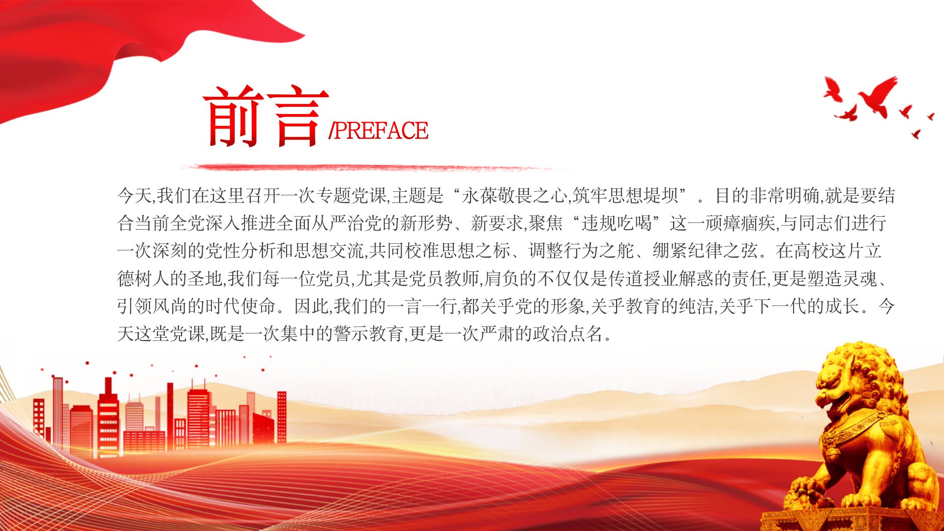 永葆敬畏之心筑牢思想堤坝今天,我们在这里召开一次专题党课,主题是“永葆敬畏之心,筑牢思想堤坝”。目的非常明确,就是要结合当前全党深入推进全面从严治党的新形势、新要求,聚焦“违规吃喝”这一顽瘴痼疾,与同志们进行一次深刻的党性分析和思想交流,共同校准思想之标、调整行为之舵、绷紧纪律之弦。在高校这片立德树人的圣地,我们每一位党员,尤其是党员教师,肩负的不仅仅是传道授业解惑的责任,更是塑造灵魂、引领风尚的时代使命。因此,我们的一言一行,都关乎党的形象,关乎教育的纯洁,关乎下一代的成长。今天这堂党课,既是一次集中的警示教育,更是一次严肃的政治点名。前言/PREFACE深刻洞察,准确把握违规吃喝问题的极端...
