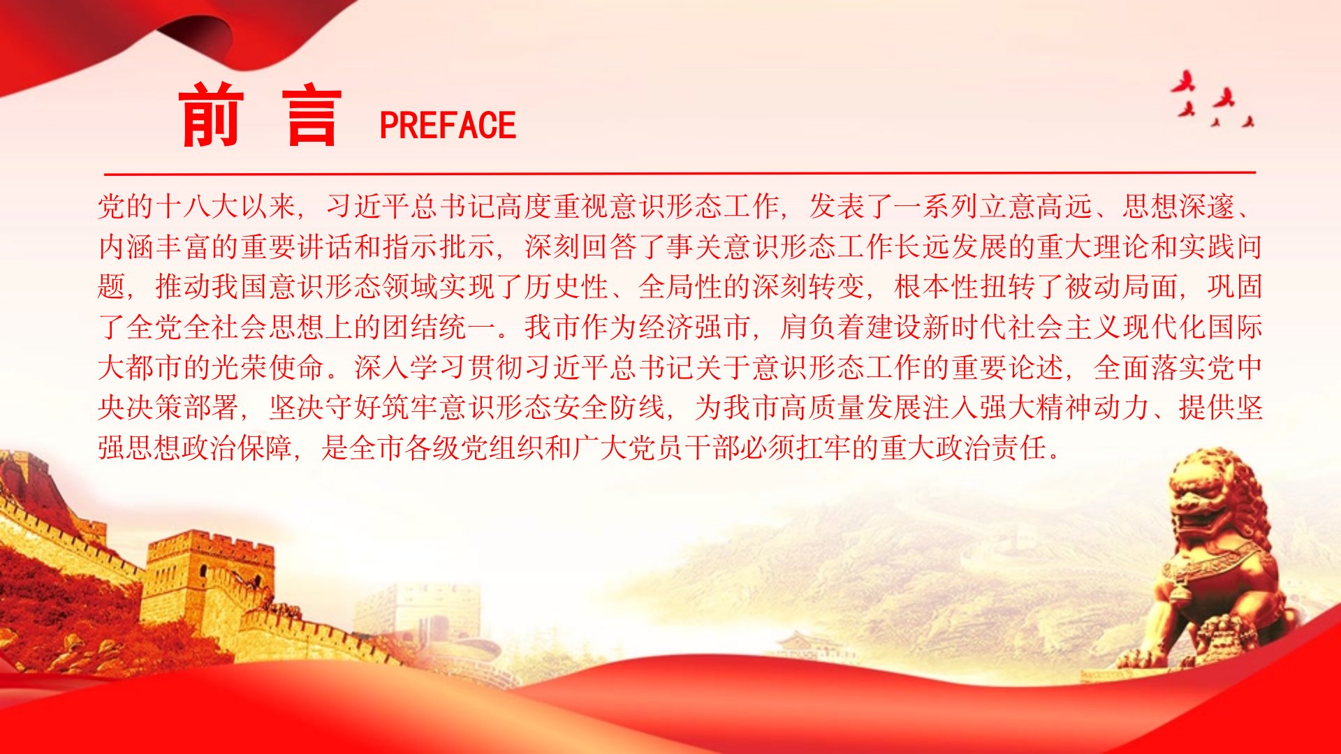 做好新时代意识形态工作,为高质量发展提供坚强的思想政治保障授课人:习近平前言PREFACE党的十八大以来,习近平总书记高度重视意识形态工作,发表了一系列立意高远、思想深邃、内涵丰富的重要讲话和指示批示,深刻回答了事关意识形态工作长远发展的重大理论和实践问题,推动我国意识形态领域实现了历史性、全局性的深刻转变,根本性扭转了被动局面,巩固了全党全社会思想上的团结统一。我市作为经济强市,肩负着建设新时代社会主义现代化国际大都市的光荣使命。深入学习贯彻习近平总书记关于意识形态工作的重要论述,全面落实党中央决策部署,坚决守好筑牢意识形态安全防线,为我市高质量发展注入强大精神动力、提供坚强思想政治保障,是...