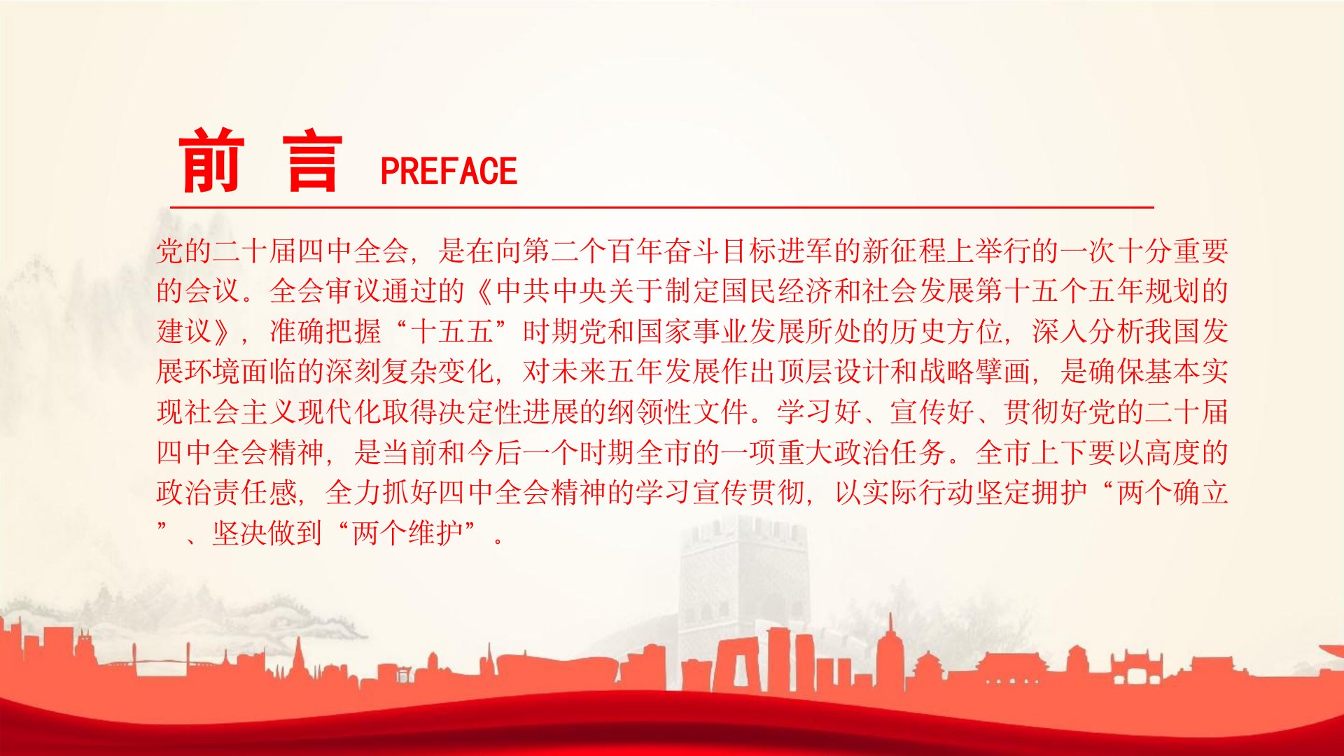 深入学习贯彻党的二十届四中全会精神,不断把中国式现代化我市实践推向前进授课人:习近平前言PREFACE党的二十届四中全会,是在向第二个百年奋斗目标进军的新征程上举行的一次十分重要的会议。全会审议通过的《中共中央关于制定国民经济和社会发展第十五个五年规划的建议》,准确把握“十五五”时期党和国家事业发展所处的历史方位,深入分析我国发展环境面临的深刻复杂变化,对未来五年发展作出顶层设计和战略擘画,是确保基本实现社会主义现代化取得决定性进展的纲领性文件。学习好、宣传好、贯彻好党的二十届四中全会精神,是当前和今后一个时期全市的一项重大政治任务。全市上下要以高度的政治责任感,全力抓好四中全会精神的学习宣传...