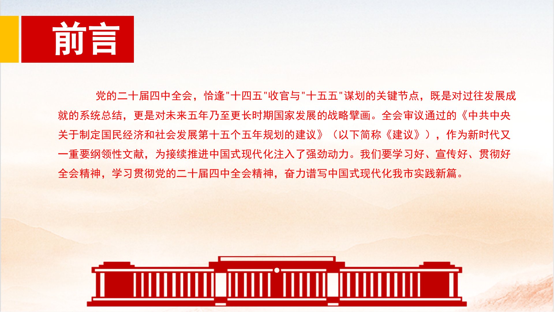 学习贯彻党的二十届四中全会精神,不断开创我市高质量发展新局面前言党的二十届四中全会,恰逢"十四五"收官与"十五五"谋划的关键节点,既是对过往发展成就的系统总结,更是对未来五年乃至更长时期国家发展的战略擘画。全会审议通过的《中共中央关于制定国民经济和社会发展第十五个五年规划的建议》(以下简称《建议》),作为新时代又一重要纲领性文献,为接续推进中国式现代化注入了强劲动力。我们要学习好、宣传好、贯彻好全会精神,学习贯彻党的二十届四中全会精神,奋力谱写中国式现代化我市实践新篇。二十届四中全会基本概况召开的时间和地点参加四中全会人员听取讨论/审议通过习近平就《建议(讨论稿)》向全会作了说明。二十届四中全...