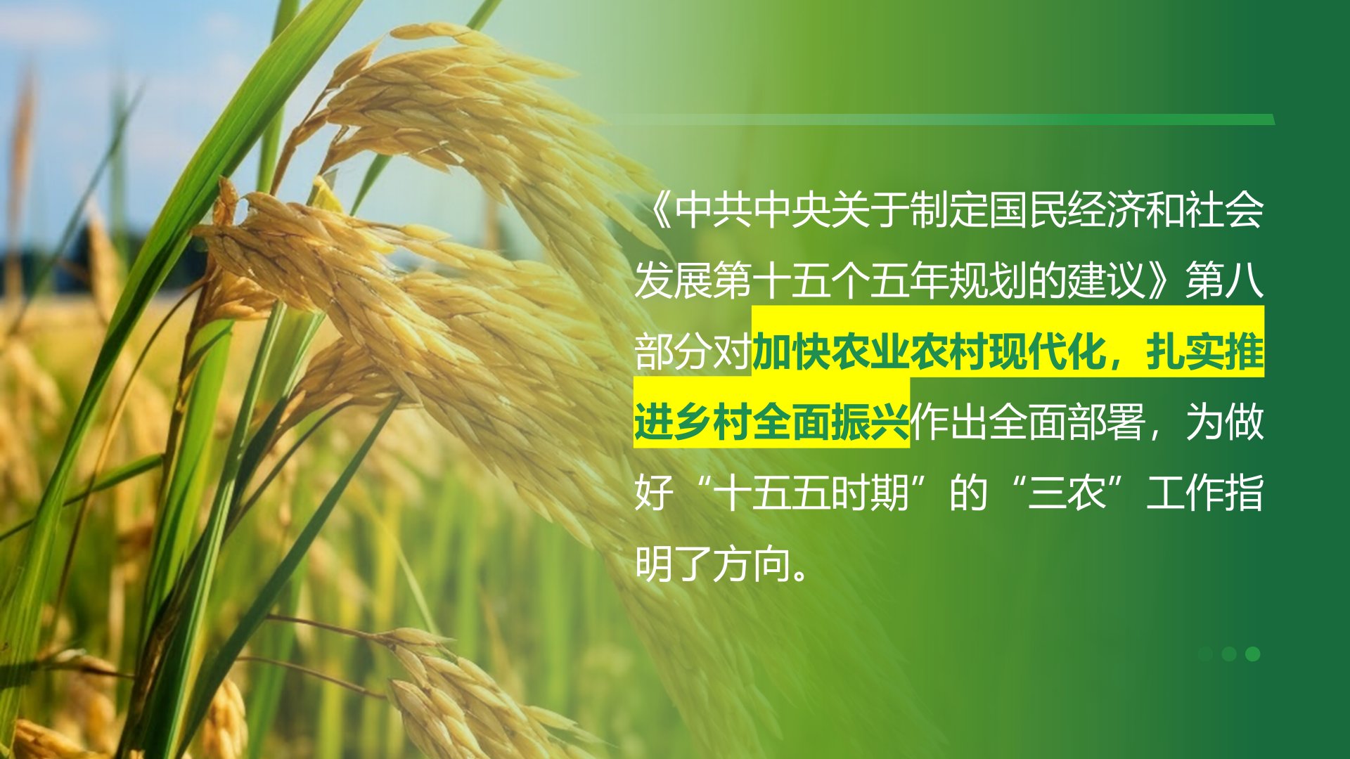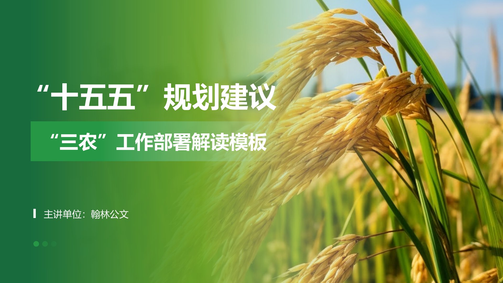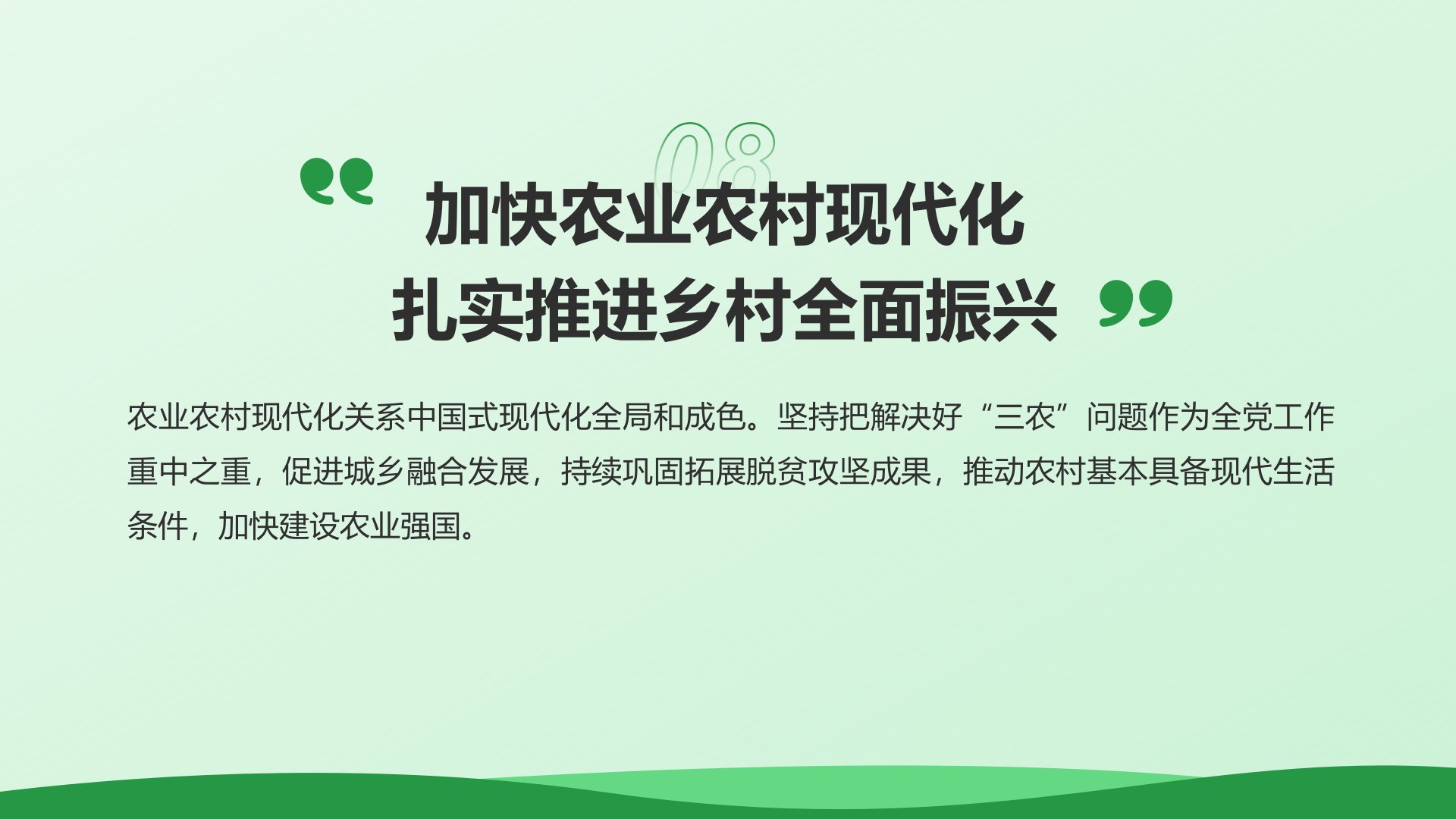 主讲单位:翰林公文《中共中央关于制定国民经济和社会发展第十五个五年规划的建议》第八部分对加快农业农村现代化,扎实推进乡村全面振兴作出全面部署,为做好“十五五时期”的“三农”工作指明了方向。08加快农业农村现代化扎实推进乡村全面振兴农业农村现代化关系中国式现代化全局和成色。坚持把解决好“三农”问题作为全党工作重中之重,促进城乡融合发展,持续巩固拓展脱贫攻坚成果,推动农村基本具备现代生活条件,加快建设农业强国。提升农业综合生产能力和质量效益了解市场需求,定位绿色兴农的商业价值01提升农业综合生产能力和质量效益提升农业综合生产能力和质量效益推进宜居宜业和美乡村建设因地制宜完善乡村建设实施机制0201...