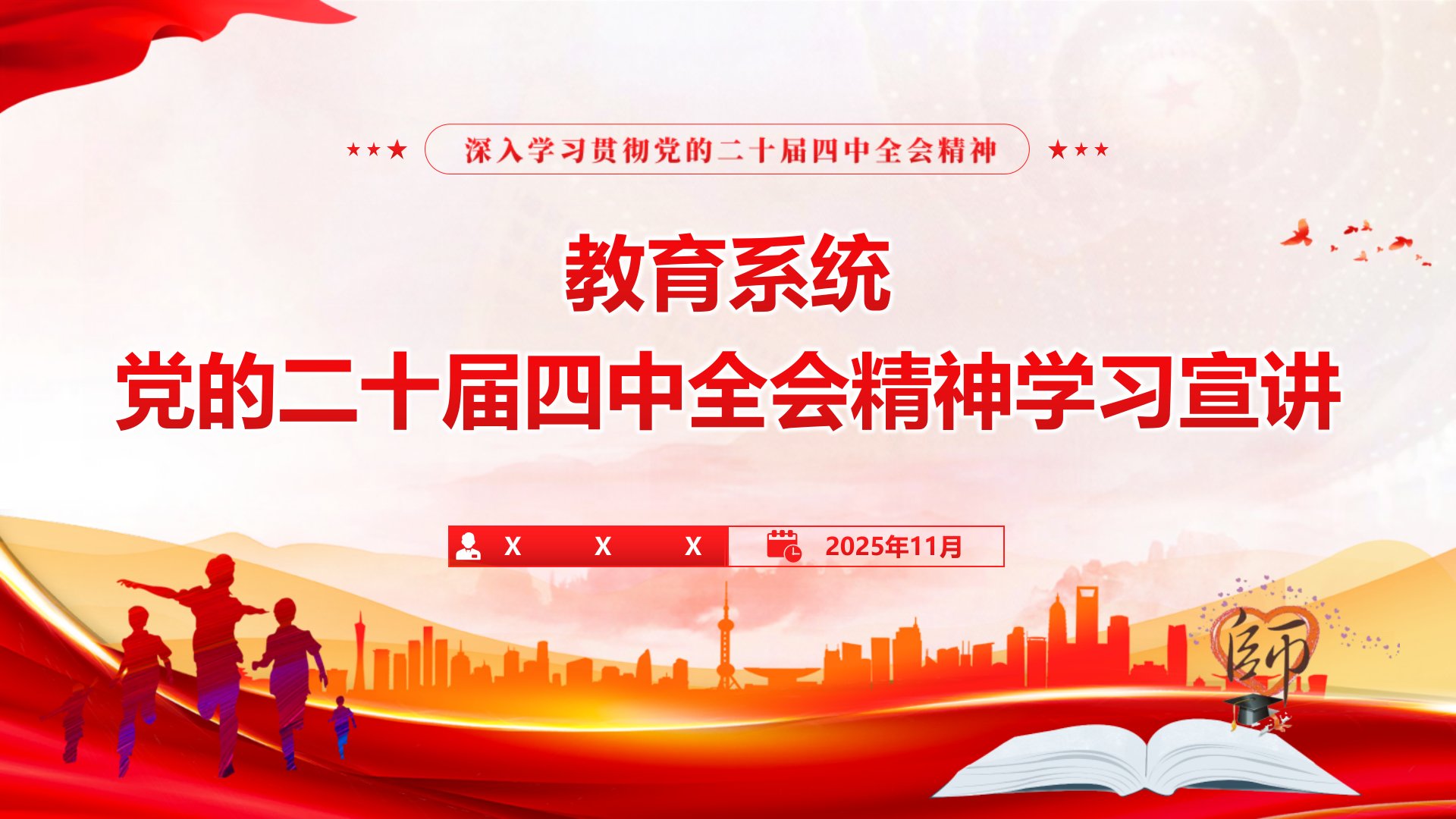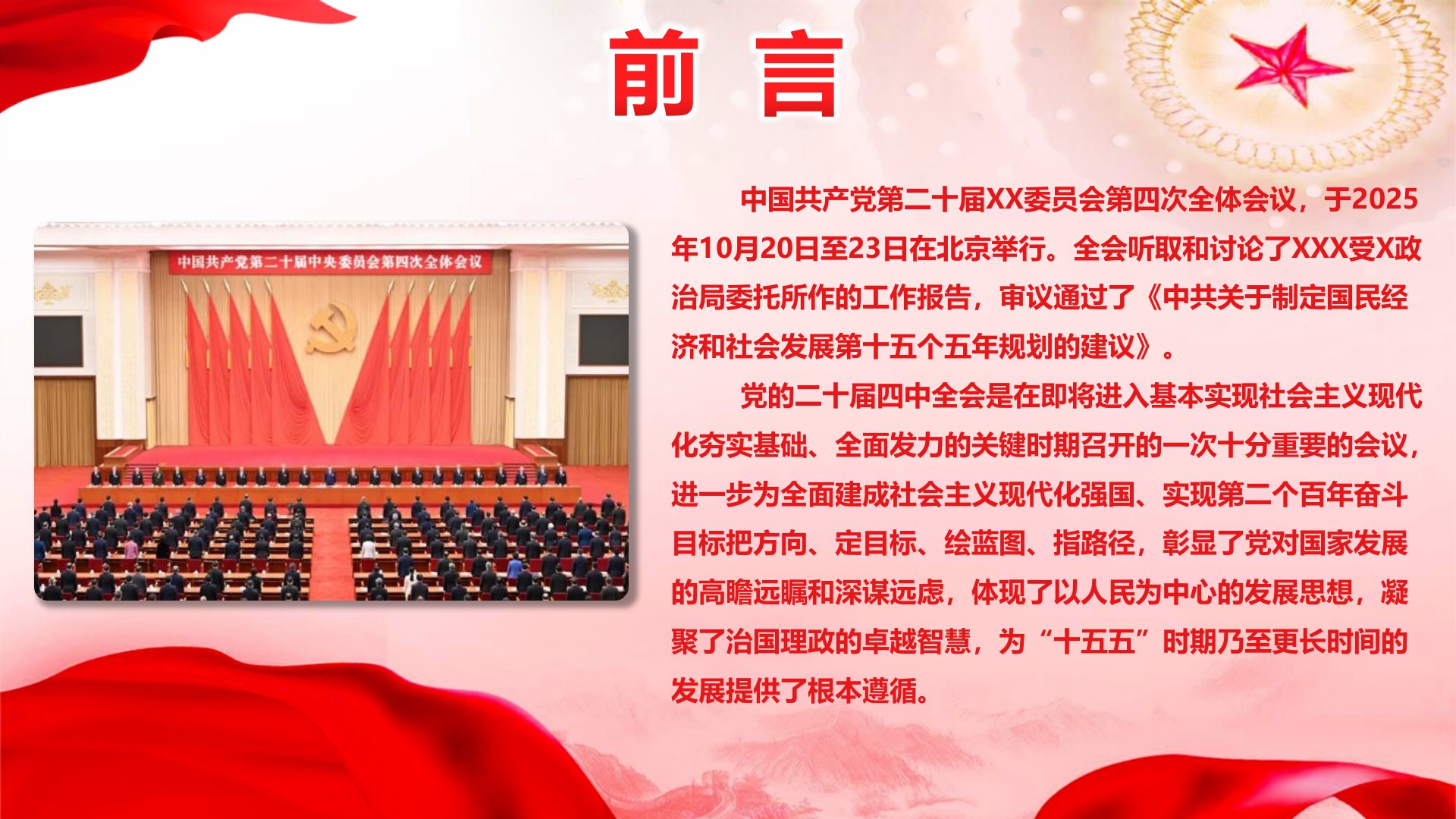 教育系统党的二十届四中全会精神学习宣讲中国共产党第二十届XX委员会第四次全体会议,于2025年10月20日至23日在北京举行。全会听取和讨论了习近平受X政治局委托所作的工作报告,审议通过了《中共关于制定国民经济和社会发展第十五个五年规划的建议》。党的二十届四中全会是在即将进入基本实现社会主义现代化夯实基础、全面发力的关键时期召开的一次十分重要的会议,进一步为全面建成社会主义现代化强国、实现第二个百年奋斗目标把方向、定目标、绘蓝图、指路径,彰显了党对国家发展的高瞻远瞩和深谋远虑,体现了以人民为中心的发展思想,凝聚了治国理政的卓越智慧,为“十五五”时期乃至更长时间的发展提供了根本遵循。前言作为教育...