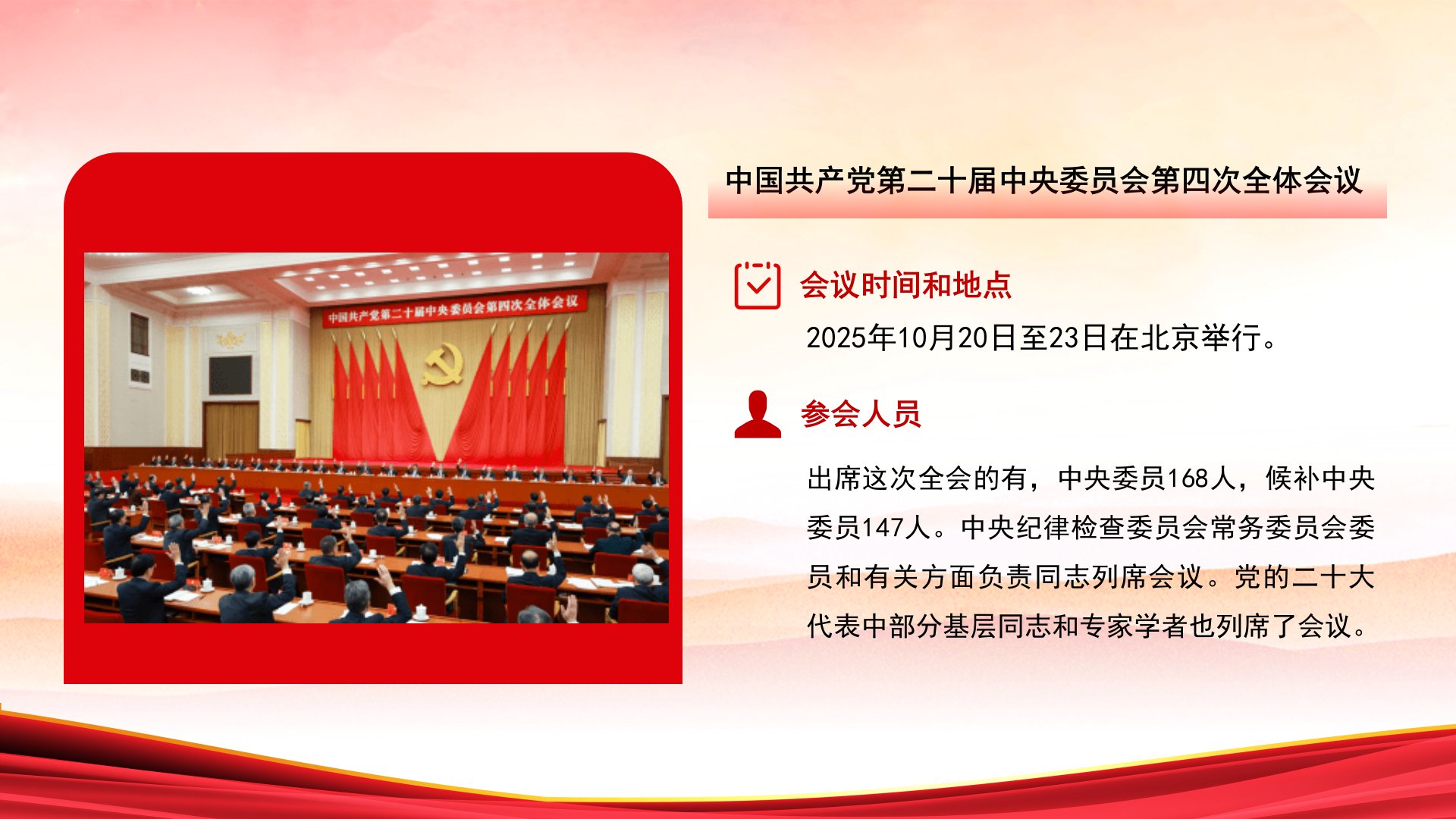 党的二十届四中全会公报学习贯彻党的二十届四中全会精神要点学习习近平中国共产党第二十届中央委员会第四次全体会议2025年10月20日至23日在北京举行。出席这次全会的有,中央委员168人,候补中央委员147人。中央纪律检查委员会常务委员会委员和有关方面负责同志列席会议。党的二十大代表中部分基层同志和专家学者也列席了会议。全会听取和讨论了习近平受中央政治局委托所作的工作报告,审议通过了《中共中央关于制定国民经济和社会发展第十五个五年规划的建议》。习近平就《建议(讨论稿)》向全会作了说明。全会由中央政治局主持。中央委员会总书记习近平作了重要讲话。全会充分肯定党的二十届三中全会以来中央政治局的工作一致...