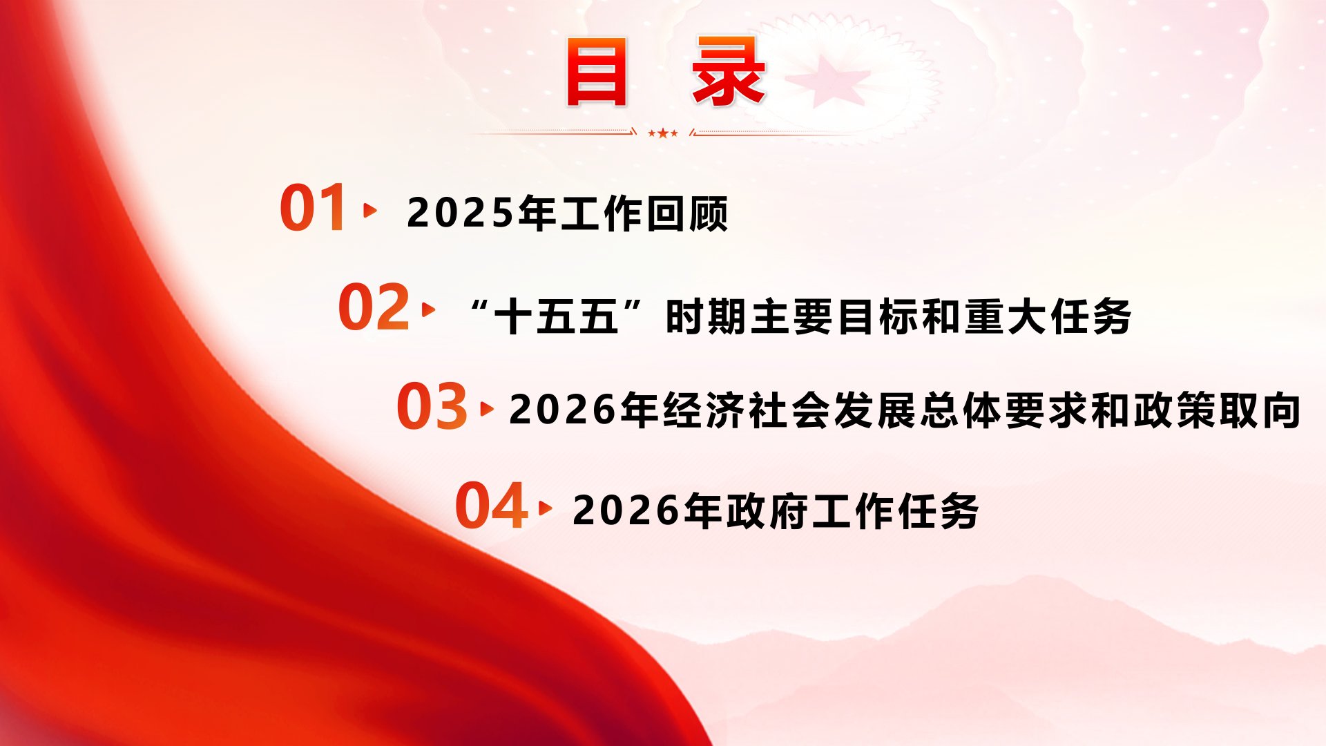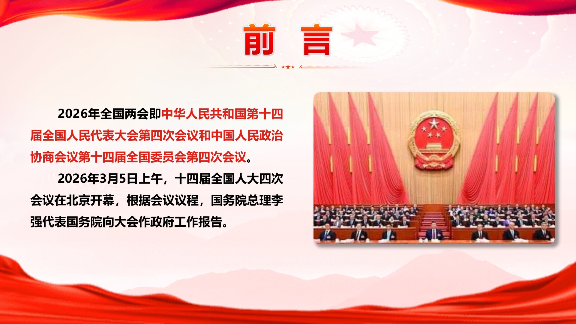 2026年全国两会政府工作报告重点内容学习前言2026年全国两会即中华人民共和国第十四届全国人民代表大会第四次会议和中国人民政治协商会议第十四届全国委员会第四次会议。2026年3月5日上午,十四届全国人大四次会议在北京开幕,根据会议议程,国务院总理李强代表国务院向大会作政府工作报告。目录2025年工作回顾一、2025年工作回顾“十四五”圆满收官,中国式现代化迈出新的坚实步伐2025年是很不平凡的一年。党的二十届四中全会胜利召开,擘画了未来五年我国发展的宏伟蓝图。我们隆重纪念中国人民抗日战争暨世界反法西斯战争胜利80周年,设立台湾光复纪念日,极大振奋民族精神、激发爱国热情、凝聚奋斗力量。一、20...