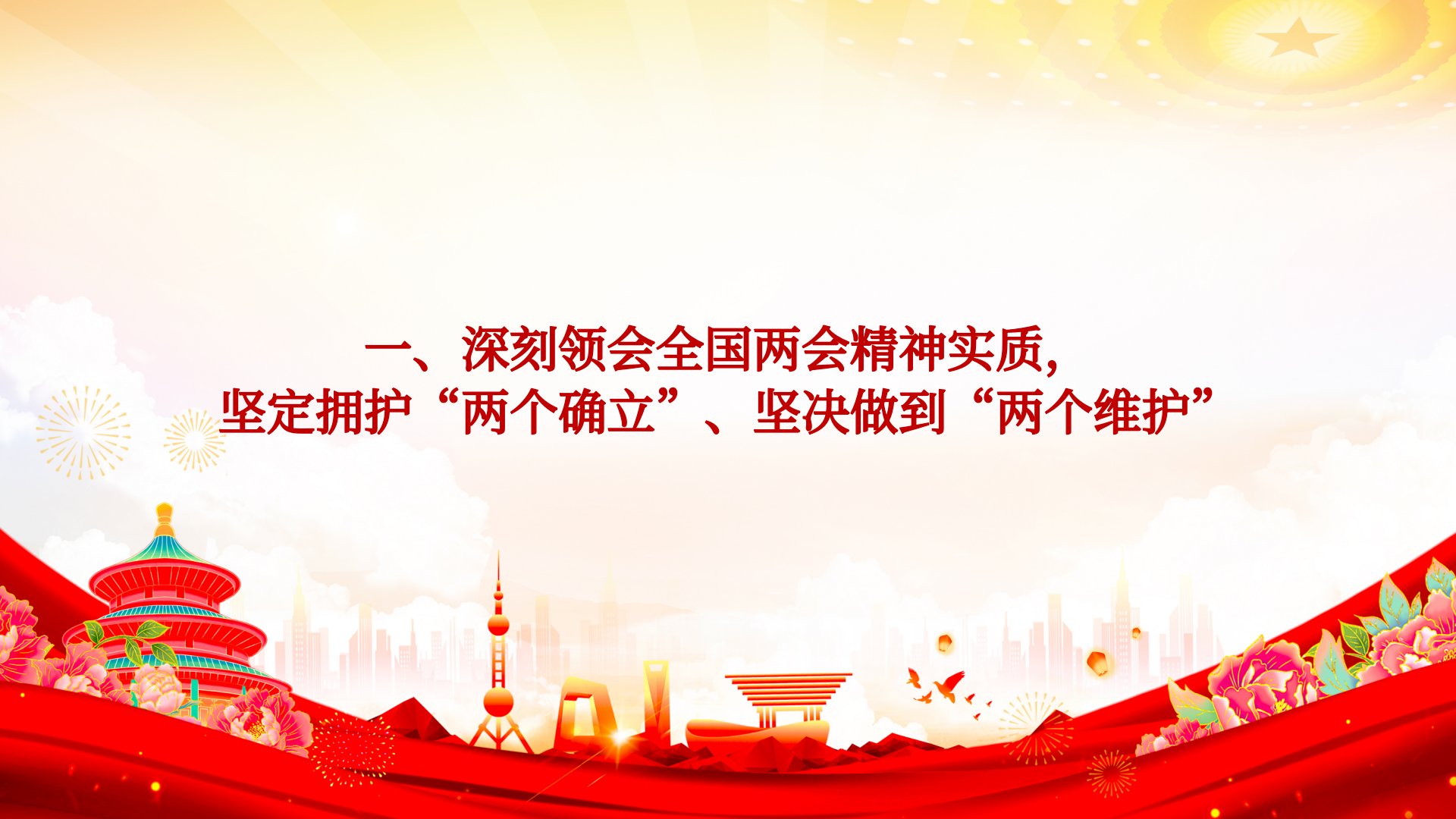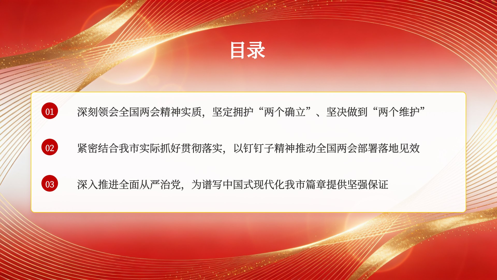 学习贯彻全国两会精神,推动我市高质量发展不断取得新成效授课人:A书记目录01深刻领会全国两会精神实质,坚定拥护“两个确立”、坚决做到“两个维护”02紧密结合我市实际抓好贯彻落实,以钉钉子精神推动全国两会部署落地见效03深入推进全面从严治党,为谱写中国式现代化我市篇章提供坚强保证一、深刻领会全国两会精神实质,坚定拥护“两个确立”、坚决做到“两个维护”(一)牢牢把握我国发展取得的重大成就,进一步坚定发展信心决心核心观点:过去一年,我国经济社会发展取得新的重大成就,这些成绩的取得,最根本在于有习近平总书记作为党中央的核心、全党的核心掌舵领航,在于有习近平新时代中国特色社会主义思想科学指引。具体阐述:...