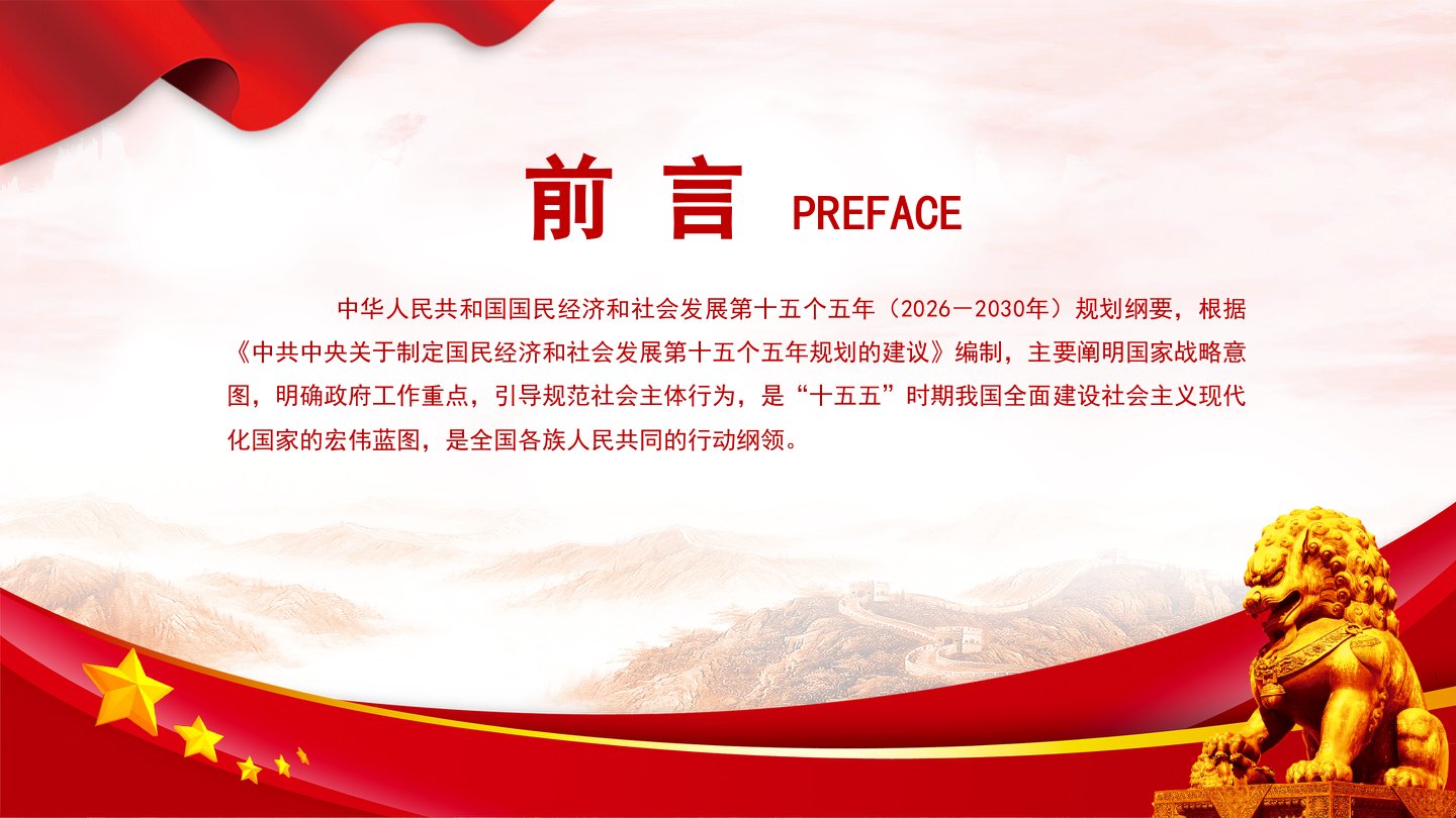 “十五五”规划纲要草案分领域重大战略任务中华人民共和国国民经济和社会发展第十五个五年(2026-2030年)规划纲要,根据《中共中央关于制定国民经济和社会发展第十五个五年规划的建议》编制,主要阐明国家战略意图,明确政府工作重点,引导规范社会主体行为,是“十五五”时期我国全面建设社会主义现代化国家的宏伟蓝图,是全国各族人民共同的行动纲领。前言PREFACE坚持把发展经济的着力点放在实体经济上,坚持智能化、绿色化、融合化方向,加快建设制造强国、质量强国、航天强国、交通强国、网络强国,保持制造业合理比重,构建以先进制造业为骨干的现代化产业体系。强化国家标准引领、数智绿色技术赋能、环保安全制度约束,巩...