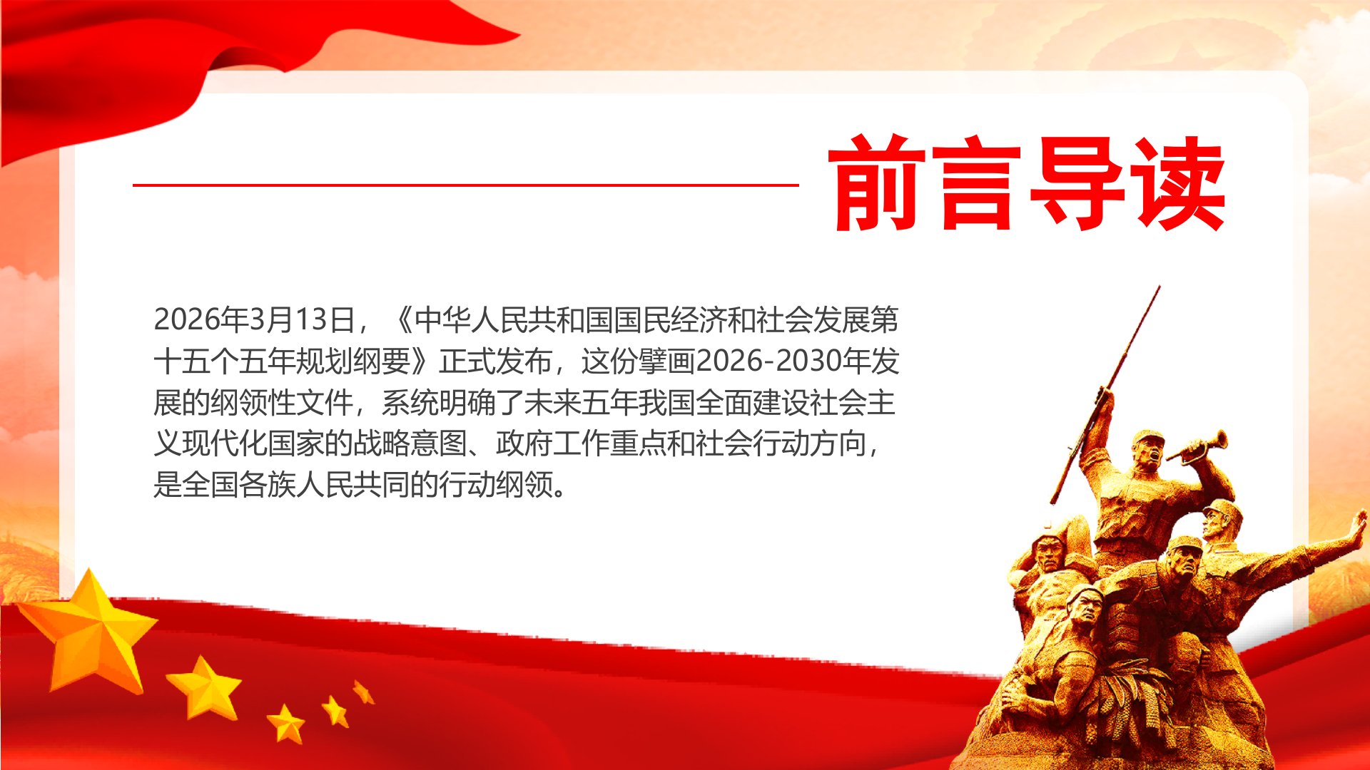 十五五规划纲要重点内容学习解读共绘”十五五”发展新蓝图前言导读2026年3月13日,《中华人民共和国国民经济和社会发展第十五个五年规划纲要》正式发布,这份擘画2026-2030年发展的纲领性文件,系统明确了未来五年我国全面建设社会主义现代化国家的战略意图、政府工作重点和社会行动方向,是全国各族人民共同的行动纲领。“十五五”时期在基本实现社会主义现代化进程中承前启后,是夯实基础、全面发力的关键五年,纲要立足当下发展环境,锚定2035年基本实现社会主义现代化目标,为未来发展勾勒出清晰蓝图。十五五规划纲要全文精华定调未来5年国家发展方向第一章立足发展实际把握机遇应对挑战立足发展实际把握机遇应对挑战立...