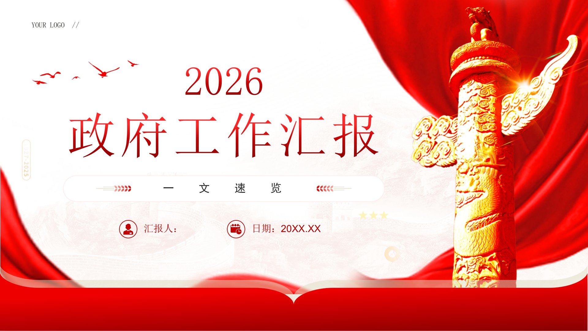 政府工作汇报2026yourlogo//Contents2025年工作回顾01/052025年工作回顾党的二十届四中全会胜利召开擘画了未来五年我国发展的宏伟蓝图。我们隆重纪念中国人民抗日战争暨世界反法西斯战争胜利80周年,设立台湾光复纪念日,极大振奋民族精神、激发爱国热情、凝聚奋斗力量。面对国内外形势深刻复杂的变化,以习近平同志为核心的党中央团结带领全国各族人民迎难而上、奋力拼搏,坚定不移贯彻新发展理念、推动高质量发展,统筹国内国际两个大局,全年经济社会发展主要目标任务顺利完成“十四五”圆满收官,中国式现代化迈出新的坚实步伐。2025年工作回顾国内生产总值增长5%总量达到140.19万亿元就业...