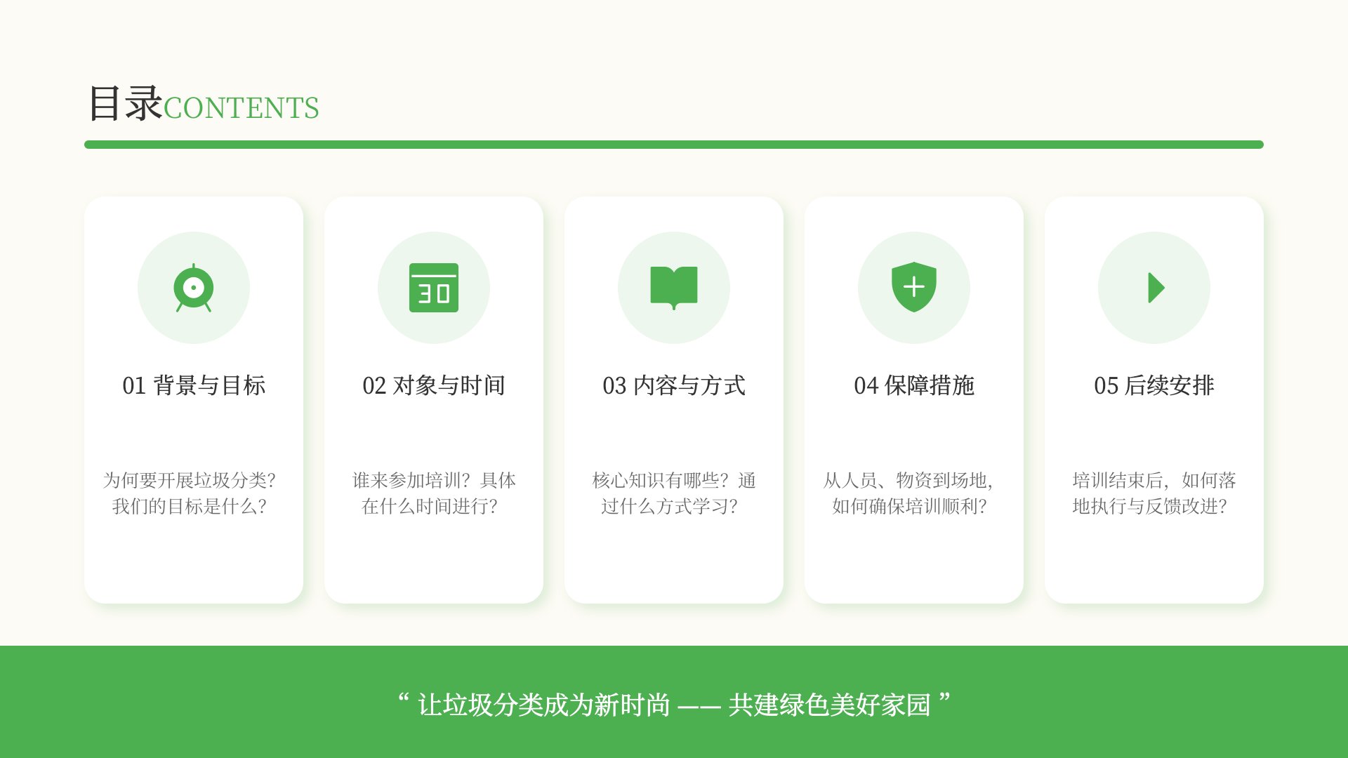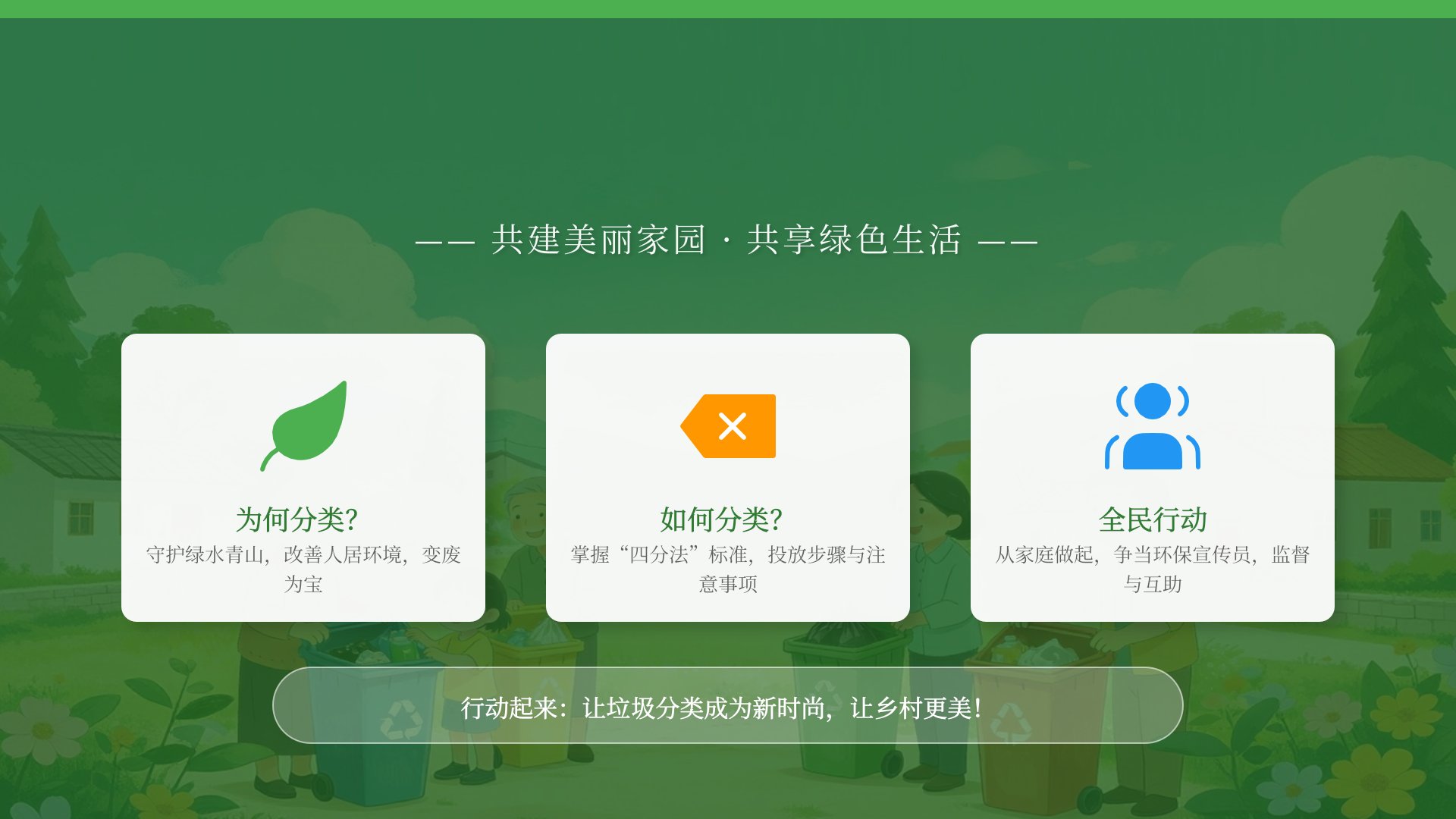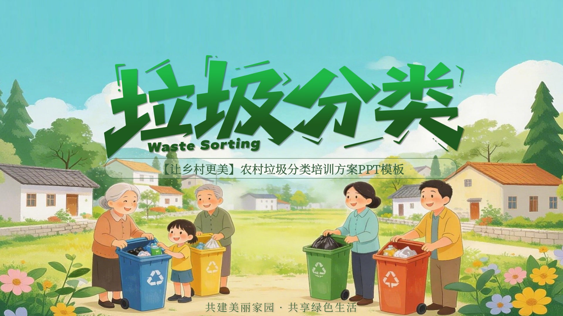 共建美丽家园·共享绿色生活——共建美丽家园·共享绿色生活——为何分类?守护绿水青山,改善人居环境,变废为宝如何分类?掌握“四分法”标准,投放步骤与注意事项全民行动从家庭做起,争当环保宣传员,监督与互助行动起来:让垃圾分类成为新时尚,让乡村更美!目录CONTENTS01背景与目标为何要开展垃圾分类?我们的目标是什么?02对象与时间谁来参加培训?具体在什么时间进行?03内容与方式核心知识有哪些?通过什么方式学习?04保障措施从人员、物资到场地,如何确保培训顺利?05后续安排培训结束后,如何落地执行与反馈改进?“让垃圾分类成为新时尚——共建绿色美好家园”01培训背景与目标:破解乡村治理痛点,提升人居...