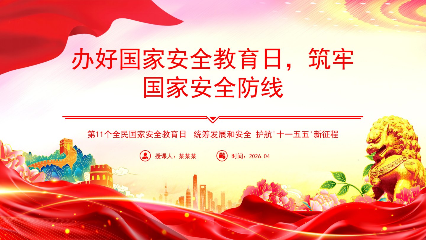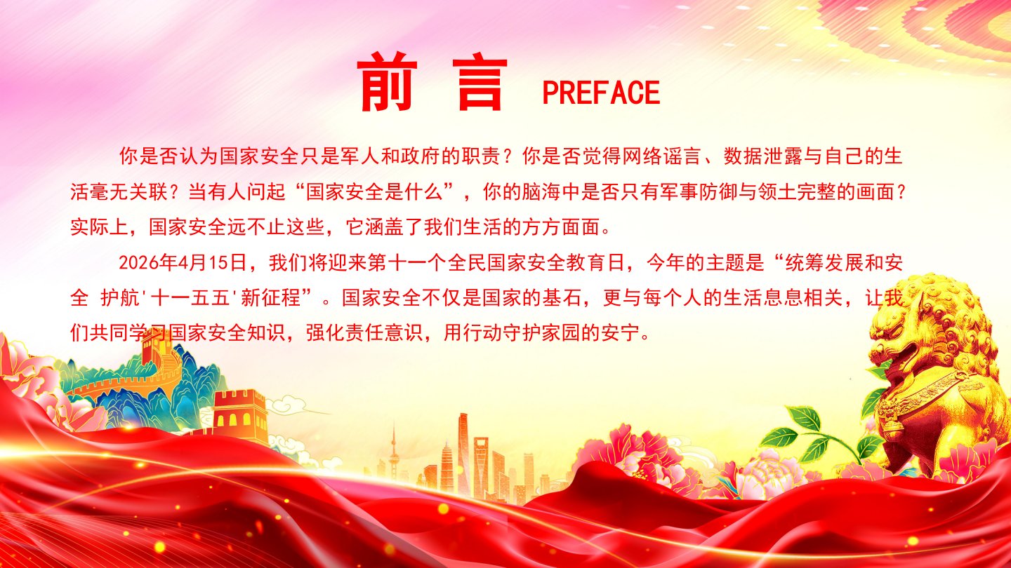 办好国家安全教育日,筑牢国家安全防线第11个全民国家安全教育日统筹发展和安全护航'十一五五'新征程你是否认为国家安全只是军人和政府的职责?你是否觉得网络谣言、数据泄露与自己的生活毫无关联?当有人问起“国家安全是什么”,你的脑海中是否只有军事防御与领土完整的画面?实际上,国家安全远不止这些,它涵盖了我们生活的方方面面。2026年4月15日,我们将迎来第十一个全民国家安全教育日,今年的主题是“统筹发展和安全护航'十一五五'新征程”。国家安全不仅是国家的基石,更与每个人的生活息息相关,让我们共同学习国家安全知识,强化责任意识,用行动守护家园的安宁。前言PREFACE设立背景[第一部分]设立背景全民...