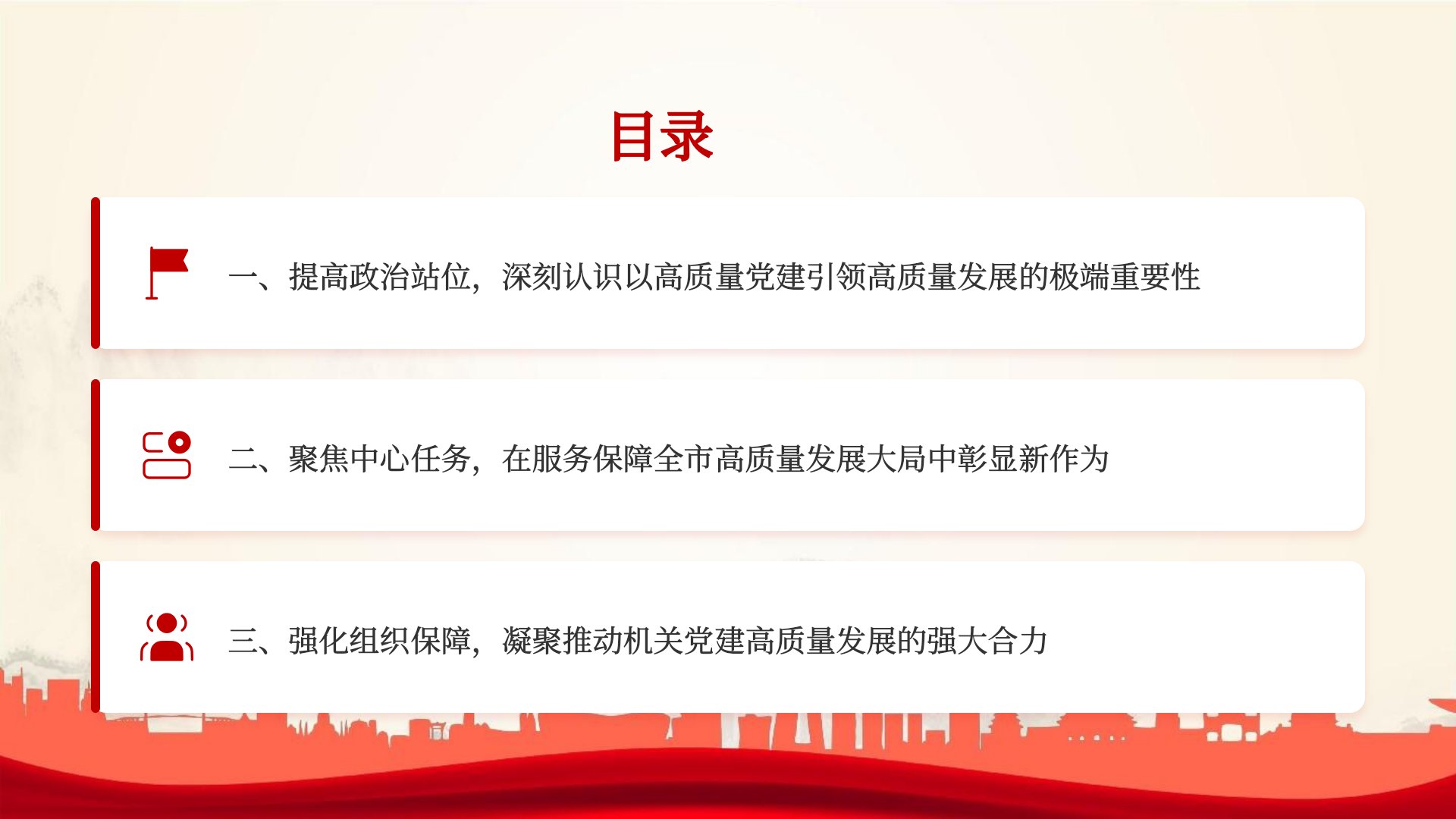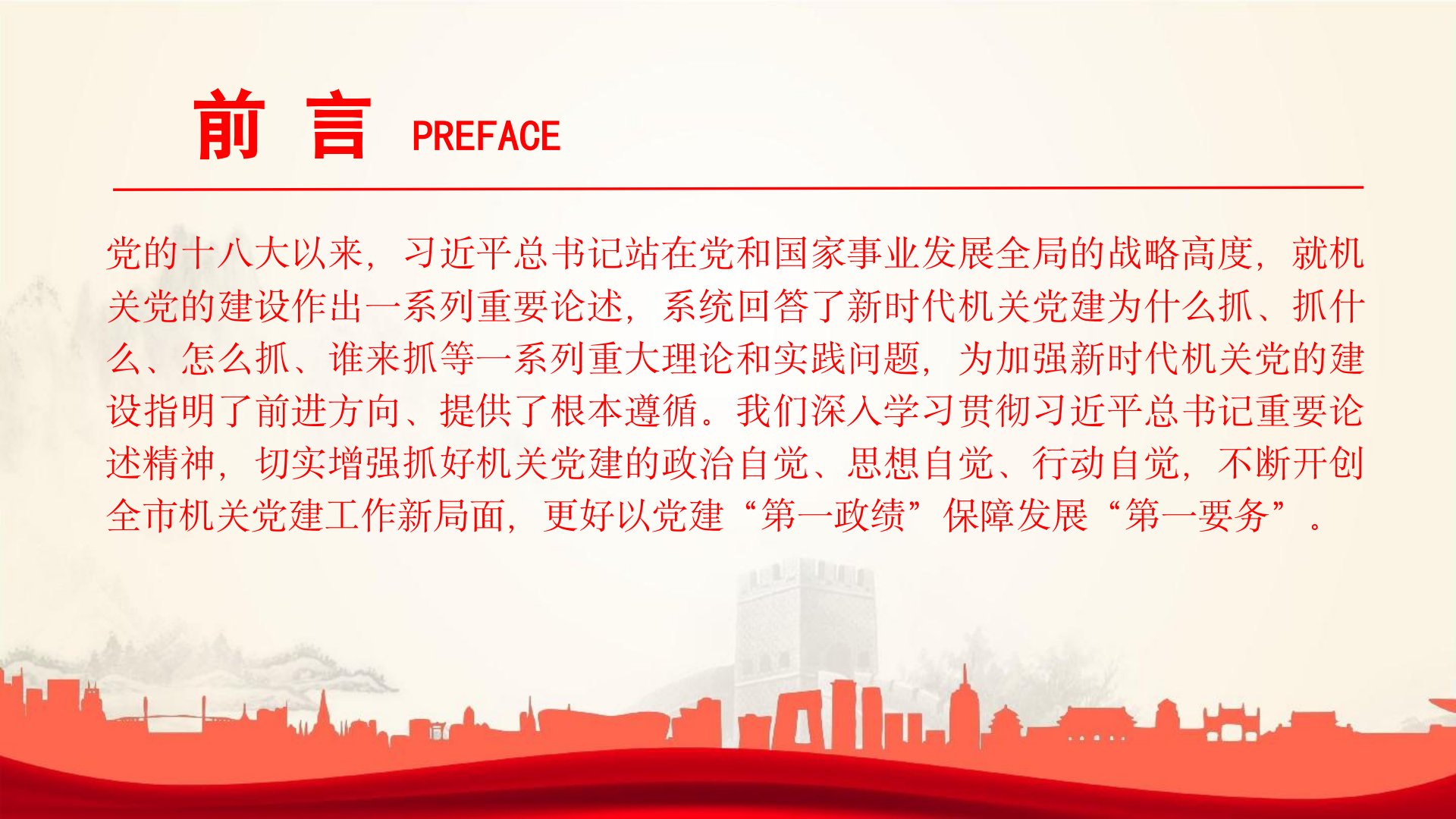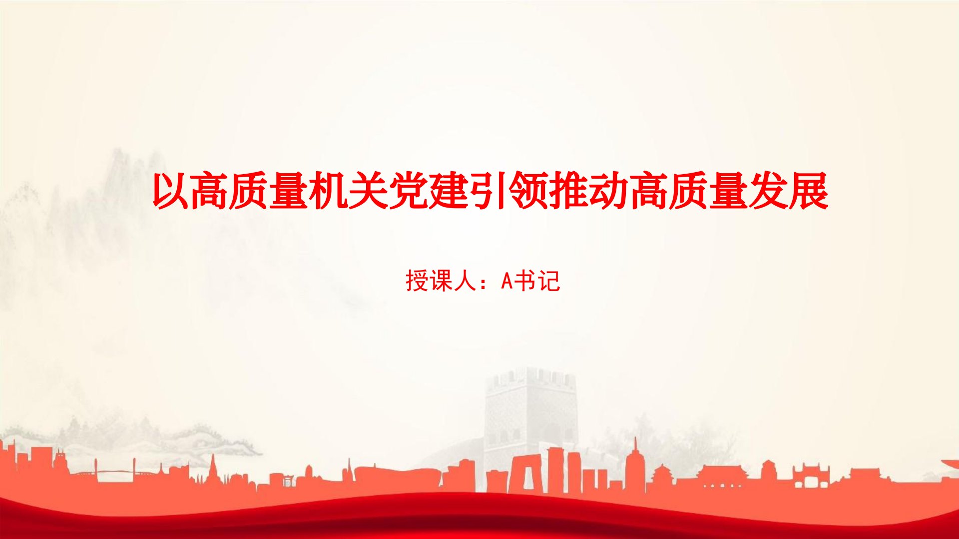以高质量机关党建引领推动高质量发展授课人:A书记前言PREFACE党的十八大以来,习近平总书记站在党和国家事业发展全局的战略高度,就机关党的建设作出一系列重要论述,系统回答了新时代机关党建为什么抓、抓什么、怎么抓、谁来抓等一系列重大理论和实践问题,为加强新时代机关党的建设指明了前进方向、提供了根本遵循。我们深入学习贯彻习近平总书记重要论述精神,切实增强抓好机关党建的政治自觉、思想自觉、行动自觉,不断开创全市机关党建工作新局面,更好以党建“第一政绩”保障发展“第一要务”。目录一、提高政治站位,深刻认识以高质量党建引领高质量发展的极端重要性二、聚焦中心任务,在服务保障全市高质量发展大局中彰显新作为...