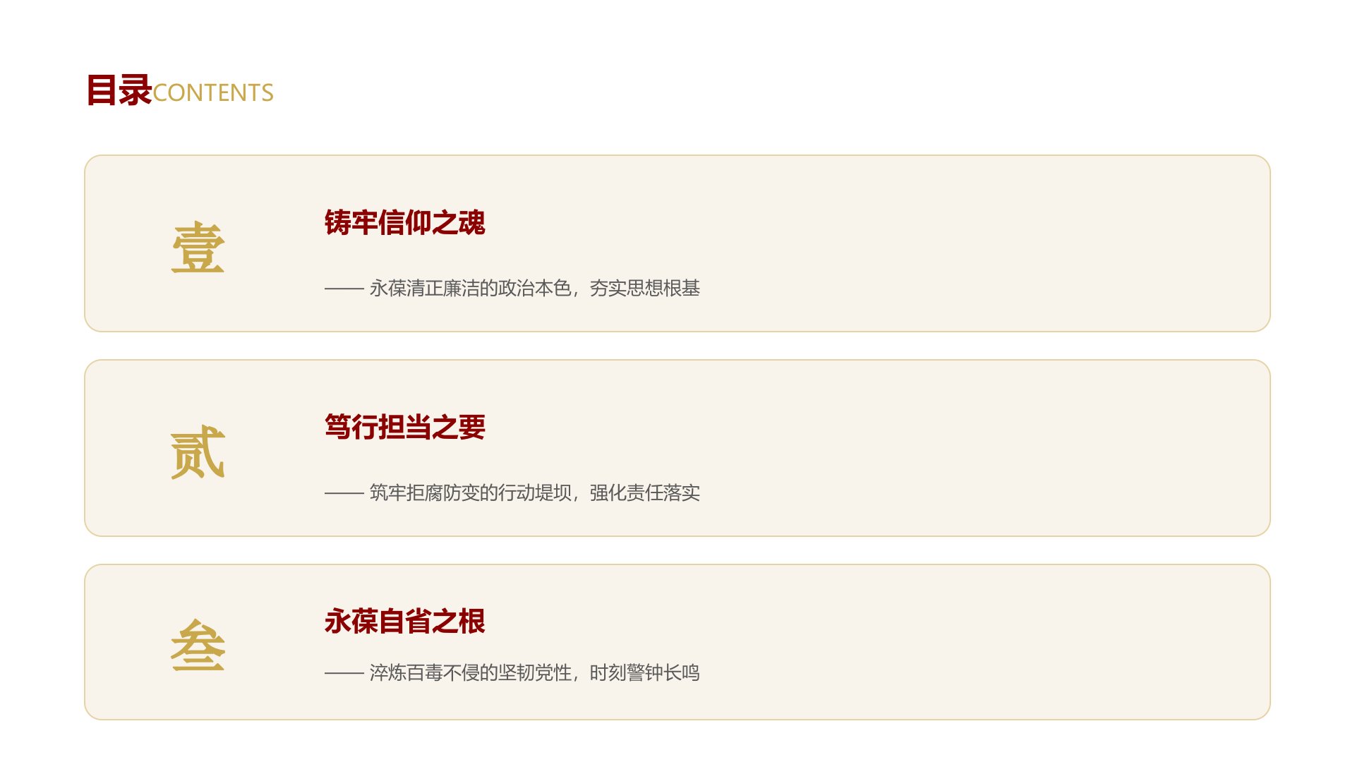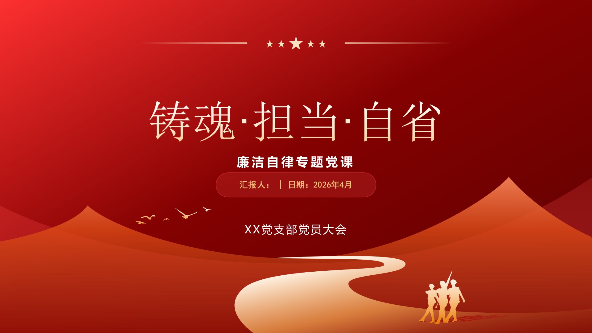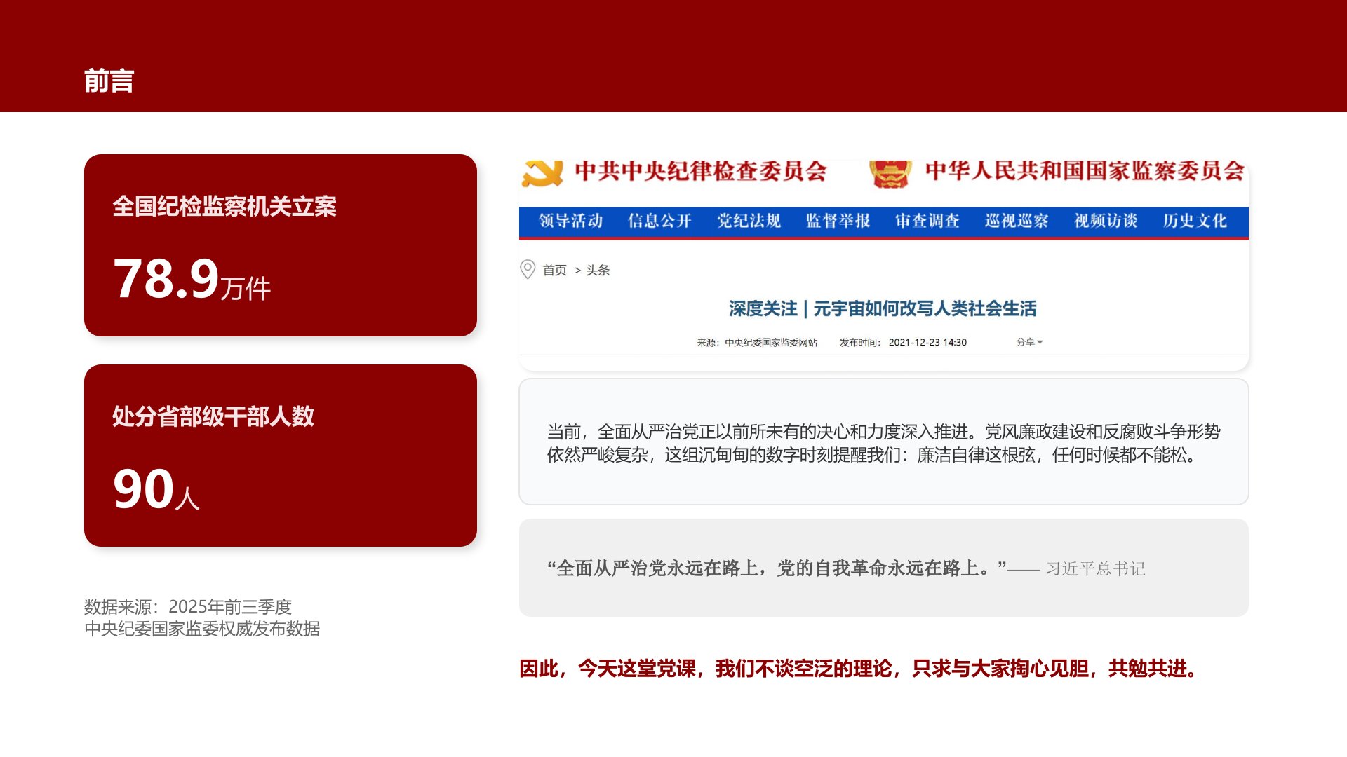 XX党支部党员大会廉洁自律专题党课铸魂·汇报人:|前言全国纪检监察机关立案78.9万件处分省部级干部人数90人数据来源:2025年前三季度中央纪委国家监委权威发布数据当前,全面从严治党正以前所未有的决心和力度深入推进。党风廉政建设和反腐败斗争形势依然严峻复杂,这组沉甸甸的数字时刻提醒我们:廉洁自律这根弦,任何时候都不能松。“全面从严治党永远在路上,党的自我革命永远在路上。”——习近平总书记因此,今天这堂党课,我们不谈空泛的理论,只求与大家掏心见胆,共勉共进。目录CONTENTS壹铸牢信仰之魂——永葆清正廉洁的政治本色,夯实思想根基贰笃行担当之要——筑牢拒腐防变的行动堤坝,强化责任落实叁永葆自省...