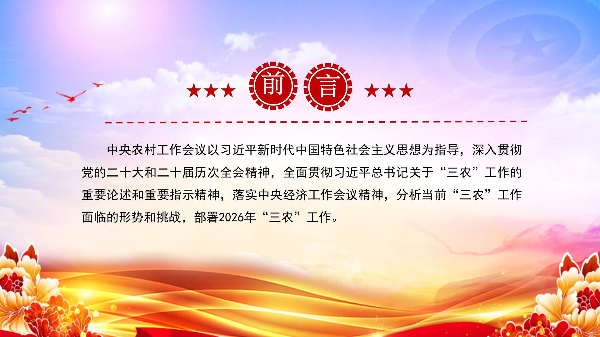深入学习贯彻中央农村工作会议,扎实推进农业强市建设中央农村工作会议以习近平新时代中国特色社会主义思想为指导,深入贯彻党的二十大和二十届历次全会精神,全面贯彻习近平总书记关于“三农”工作的重要论述和重要指示精神,落实中央经济工作会议精神,分析当前“三农”工作面临的形势和挑战,部署2026年“三农”工作。