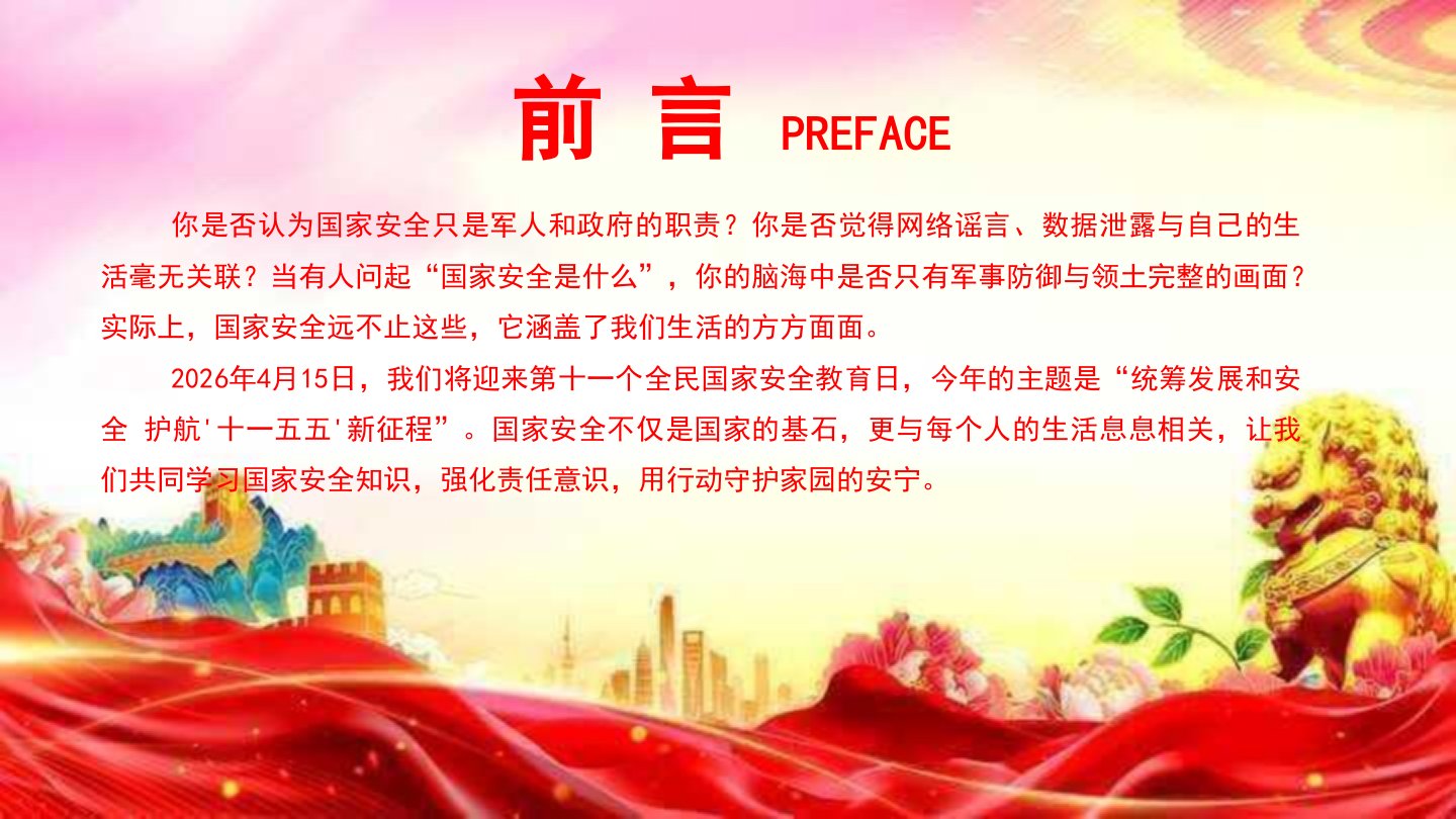 办好国家安全教育日筑牢国家安全防线你是否认为国家安全只是军人和政府的职责?你是否觉得网络谣言、数据泄露与自己的生活毫无关联?当有人问起“国家安全是什么”,你的脑海中是否只有军事防御与领土完整的画面?实际上,国家安全远不止这些,它涵盖了我们生活的方方面面。2026年4月15日,我们将迎来第十一个全民国家安全教育日,今年的主题是“统筹发展和安全护航'十一五五'新征程”。国家安全不仅是国家的基石,更与每个人的生活息息相关,让我们共同学习国家安全知识,强化责任意识,用行动守护家园的安宁。前言PREFACE设立背景[第一部分]设立背景全民国家安全教育日是为了增强全民国家安全意识,维护国家安全而设立的节日...