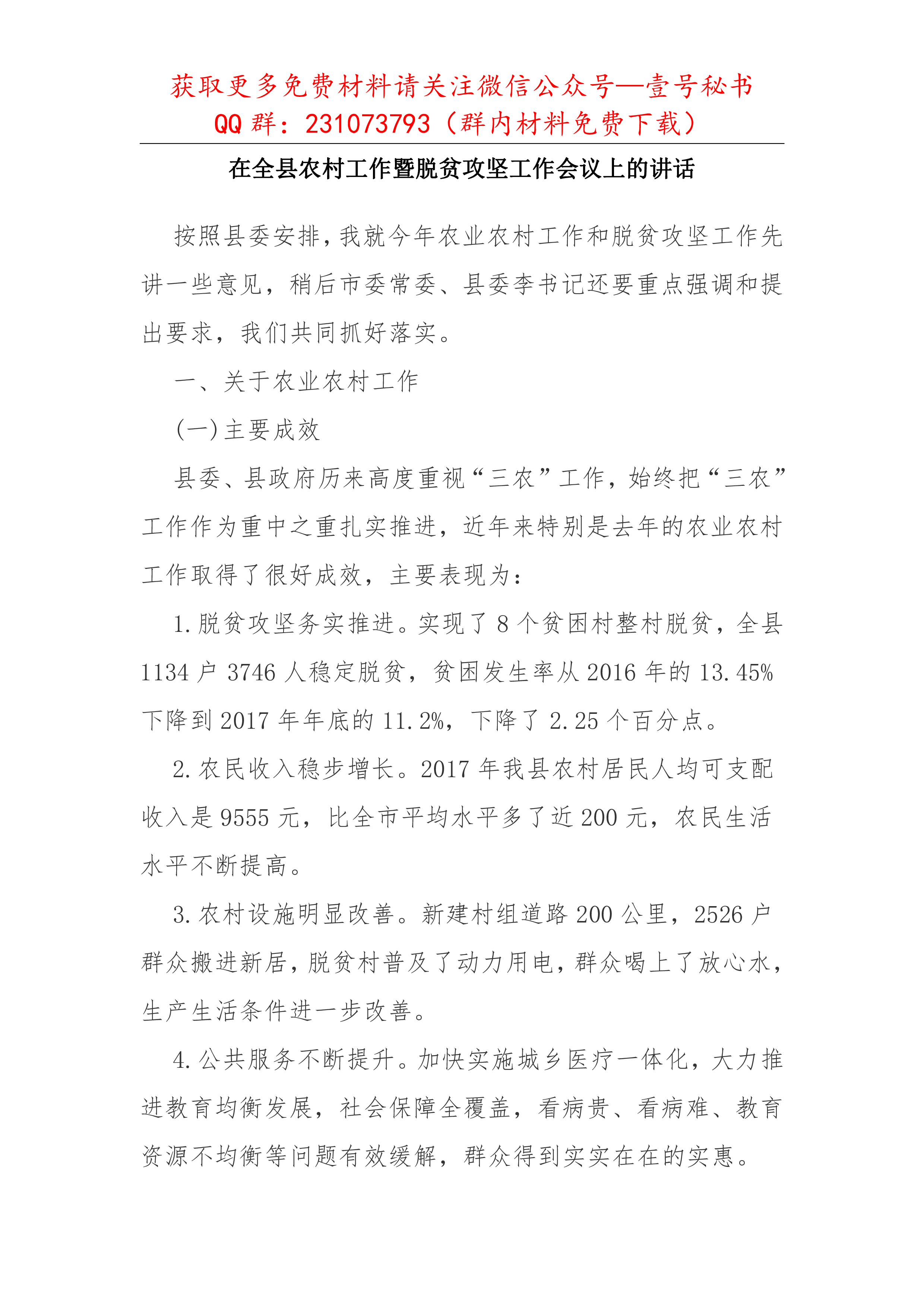 标题:会议讲话—在全县农村工作暨脱贫攻坚工作会议上的讲话