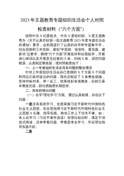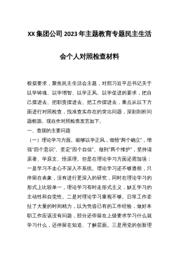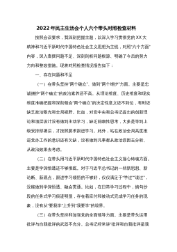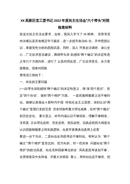 XX高新区党工委书记2022年度民主生活会“六个带头”对照检查材料按这次民主生活会要求,会前,我深入学习了XX精神、党章等党内法规以及其他规定学习篇目,进一步提升政治站位,升华思想认识,掌握党性分析的思想武器。同时,深入开展走访调研、谈心交心,广泛征求意见建议,围绕带头深刻感悟“两个确立”的决定性意义等六个方面内容,进行了认真对照反思,广泛征求意见,全力查摆整改。现将对照检查情况汇报如下:一、存在的主要问题(一)在带头深刻感悟“两个确立”的决定性意义,增强“四个意识”、坚定“四个自信”、做到“两个维护”方面。一是把握精髓要义还不够到位。能够认真领会A新时代中国特色社会主义思想,深刻认识“两个确...