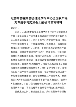 纪委常委在常委会理论学习中心全面从严治党专题学习交流会上的研讨发言材料同志们:刚才,××同志带领专题学习了习近平总书记重要署名文章《健全全面从严治党体系推动新时代党的建设新的伟大工程向纵深发展》。习近平总书记在文章中指出,要以严明纪律规范党员、干部履职用权,抓早抓小、防微杜渐精准运用“四种形态”,让党员、干部切身感受到党的严管和厚爱。纪律是管党治党的“戒尺”,也是党员、干部约束自身行为的标准和遵循。党的十八大以来,习近平总书记高度重视党的纪律建设,多次强调要把纪律建设摆在更加突出位置。在党的XX大报告中,习近平总书记提出了全面加强党的纪律建设的战略任务。我们要学习领会好、贯彻落实好习近平总书记...