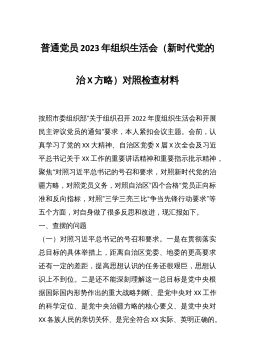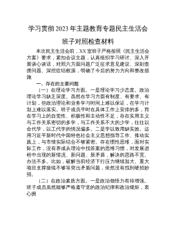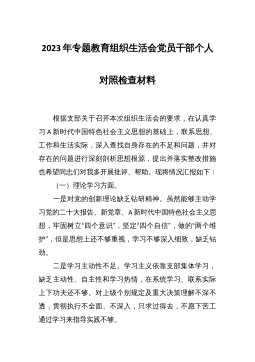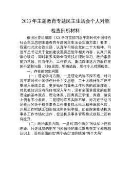 2023年主题教育专题民主生活会领导干部职工个人对照检查剖析材料按照中央和省委、市委关于开好专题民主生活会的部署,我紧扣学习贯彻习近平新时代中国特色社会主义思想这一主题,对照文件明确的理论学习、政治素质、能力本领、担当作为、工作作风、廉洁自律等六个方面和以学铸魂、以学增智、以学正风、以学促干方面提出的“十二个方面”的具体要求,我结合思想和工作实际,认真进行党性分析,深入开展批评和自我批评,对照谈心谈话以及开展意见征集到的意见XX条,归纳意见XX条,通过深挖问题根源,认真制定整改措施,现将对照检查情况报告如下。一、存在的问题(一)在理论学习方面。一是理论学习系统性不强。学习习近平新时代中国特色社...