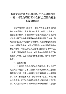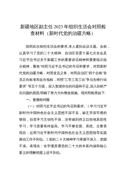新疆地区副主任2023年组织生活会对照检查材料(新时代党的治疆方略)按照此次组织生活会的要求,本人紧扣会议主题。会前,认真学习了党的二十大精神、自治区党委十届七次全会及习近平总书记关于新疆工作的重要讲话精神和重要指示批示精神,聚焦“对照习近平总书记的号召和要求,对照新时代党的治疆方略,对照党员义务,对照自治区“四个合格”党员正向标准和反向指标,对照“三学三亮三比”争当先锋行动要求”等五个方面,深入查摆存在的问题和不足,深入剖析产生问题的原因,明确了努力方向整改措施。现对照检查如下:一、查摆的问题(一)对照习近平总书记的号召和要求。1.学习习近平新时代中国特色社会主义思想不深不实,缺乏学深学透的...