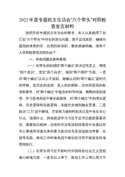 党委班子2022年度民主生活会“六个带头”对照检查材料一、检视剖析的主要问题(一)带头深刻领悟“两个确立”的决定性意义,增强“四个意识”、坚定“四个自信”、做到“两个维护”方面。一是同心同德有差距。市党委班子对“两个确立”的认识的深度、广度、维度都有差距,个别领导同志口是心非、当面一套背后一套,政治不清醒、立场不坚定,在xx问题上犯迷糊,在xx的事件中,认识含糊、态度暧昧、行动动摇,以至于导致xx问题的发生,造成了恶劣的政治影响。x月前,虽然我们召开了以案促改民主生活会,但受xx影响,重整行装再出发的劲头还不足。二是同步同频有差距。这两年,因为xx原因,市党委班子一直不太整齐和稳定,xx岗位存...