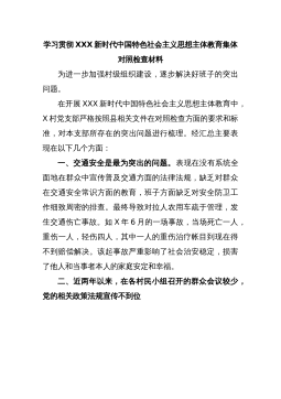 学习贯彻习近平新时代中国特色社会主义思想主体教育集体对照检查材料为进一步加强村级组织建设,逐步解决好班子的突出问题。在开展习近平新时代中国特色社会主义思想主体教育中,X村党支部严格按照县相关文件在对照检查方面的要求和标准,对本支部所存在的突出问题进行梳理。经汇总主要表现在以下几个方面:一、交通安全是最为突出的问题。表现在没有系统全面地在群众中宣传普及交通方面的法律法规,缺乏对群众在交通安全常识方面的教育,班子方面缺乏对安全防卫工作细致周密的排查。最终导致对拉人农用车疏于管理,发生交通伤亡事故。如X年6月的一场事故,当场死亡一人,重伤一人,轻伤四人,其中一人的重伤治疗帐目到现在得不到赔偿解决。该...