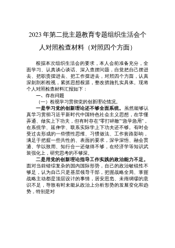 党委班子2022年度民主生活会“六个带头”对照检查材料按照县纪委、县委组织部的有关部署要求,本人紧扣2022年度民主生活会主题,会前认真开展理论学习,深入学习党章党规党纪、《习近平谈治国理政》第四卷等和党的二十大会议精神,学习习近平总书记对机关管理工作的重要指示批示精神,进行了专题集中学习研讨,认真开展谈心谈话、广泛征求意见建议,结合自己思想、工作和生活实际,对照党员标准认真查摆问题、深刻剖析问题根源,进一步明确了努力方向和改进措施。现将对照检查情况汇报如下:一、存在的主要问题(一)是否带头深刻领悟“两个确立”的决定性意义,增强“四个意识”、坚定“四个自信”、做到“两个维护”方面。一是政治理论...