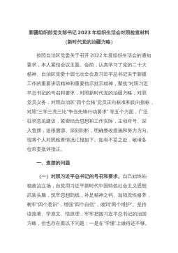 新疆组织部党支部书记2023年组织生活会对照检查材料(新时代党的治疆方略)按照自治区党委关于召开2022年度组织生活会的通知要求,本人紧扣会议主题。会前,认真学习了党的二十大精神、自治区党委十届七次全会及习近平总书记关于新疆工作的重要讲话精神和重要指示批示精神,聚焦“对照习近平总书记的号召和要求,对照新时代党的治疆方略,对照党员义务,对照自治区“四个合格”党员正向标准和反向指标,对照“三学三亮三比”争当先锋行动要求”等五个方面,广泛征求意见建议,紧密结合思想和工作实际,主动对号、深入查摆,追根溯源、深刻剖析,明确整改措施和努力方向。现将个人对照检查情况汇报如下。如有不妥之处,敬请各位常委批评指...