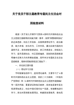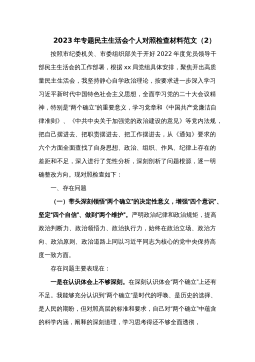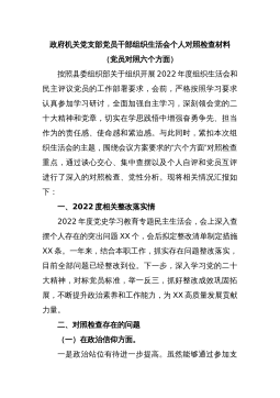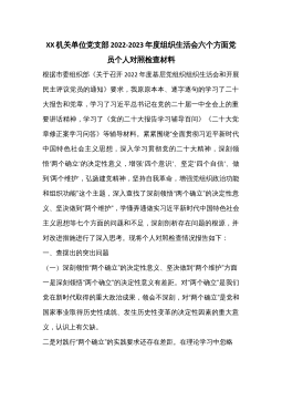 XX机关单位党支部2022-2023年度组织生活会六个方面党员个人对照检查材料根据市委组织部《关于召开2022年度基层党组织组织生活会和开展民主评议党员的通知》要求,我原原本本、逐字逐句的学习了二十大报告和党章,学习了习近平总书记在党的二十届一中全会上的重要讲话精神,学习了《党的二十大报告学习辅导百问》《二十大党章修正案学习问答》等辅导材料。紧紧围绕“全面贯彻习近平新时代中国特色社会主义思想,深入学习贯彻党的二十大精神,深刻领悟'两个确立'的决定性意义,增强'四个意识'、坚定'四个自信'、做到'两个维护',弘扬建党精神,坚持自我革命,增强党组织政治功能和组织功能”这个主题,深入查找了深刻领悟“...