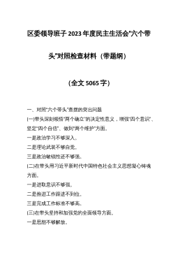 区委领导班子2023年度民主生活会“六个带头”对照检查材料(带题纲)(全文5065字)一、对照“六个带头”查摆的突出问题(一)带头深刻领悟“两个确立”的决定性意义,增强“四个意识”、坚定“四个自信”、做到“两个维护”方面。一是政治学习不够深入。二是理论武装不够自觉。三是政治敏锐性还不够强。(二)在带头用习近平新时代中国特色社会主义思想凝心铸魂方面。一是进取意识不够强。二是推进工作跟进不到位。三是完成工作标准不够高。(三)在带头坚持和加强党的全面领导方面。一是思想不够解放。二是创新意识不够强。三是主动服务意识不足。(四)在带头学习坚持以人民为中心的发展思想,推动改革发展稳定方面。一是“群众思维”...