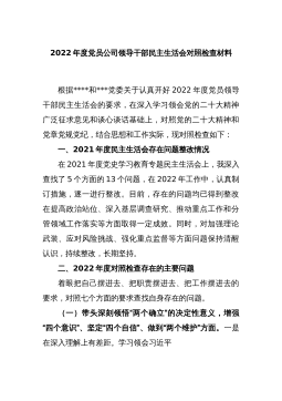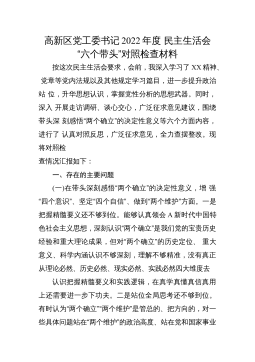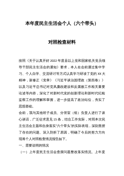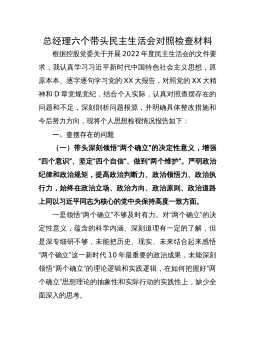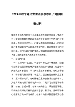 2023年领导班子六个方面专题民主生活会对照检查材料范文根据本次民主生活会要求,现将有关情况报告如下:一、上年度民主生活会整改措施落实情况针对2021年党史学习教育民主生活会查摆出的问题和思想根源,我局领导班子坚持以习近平新时代中国特色社会主义思想为指导,认真贯彻新时代党的建设总要求,既立足当前加快解决存在的突出问题,又着眼长远、建立健全工作长效机制,切实加强市x局领导班子建设。(一)始终把党的政治建设摆在首位,坚决做到“两个维护”突出“讲政治”这一鲜明主题,旗帜鲜明讲政治抓政治,坚持把学习贯彻习近平新时代中国特色社会主义思想作为党组会议、理论学习中心组、党支部学习的“第一议题”“常设议题”和...