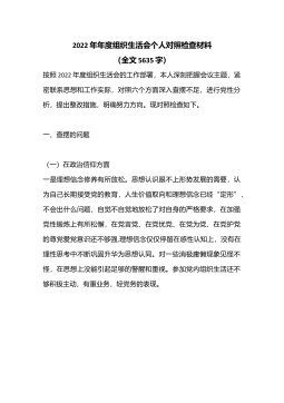 2022年年度组织生活会个人对照检查材料(对照六个方面)按照2022年度组织生活会的工作部署,本人深刻把握会议主题,紧密联系思想和工作实际,对照六个方面深入查摆不足,进行党性分析,提出整改措施,明确努力方向。现对照检查如下。—、查摆的问题(一)在政治信仰方面一是理想信念修养有所放松。思想认识跟不上形势发展的需要,认为自己长期接受党的教育,人生价值取向和理想信念已经“定形”、不会出什么问题,自觉不自觉地放松了对自身的严格要求,在加强党性锻炼上有所松懈,在党言党在党忧党、在党为党、在党护党的尊党爱党意识还不够强,理想信念仅仅停留在感性认知上,没有在理性思考中不断巩固升华为思想认同。对一些消极庸懒现...