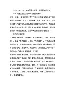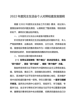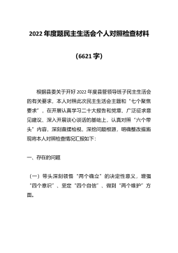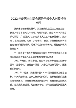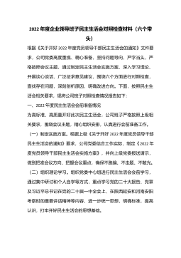 2022年度企业领导班子民主生活会对照检查材料(六个带头)根据《关于开好2022年度党员领导干部民主生活会的通知》文件要求,公司党委高度重视、精心准备,坚持问题导向,严字当头,严格按照会议主题,通过制定民主生活会实施方案、深入学习理论、开展谈心谈话、广泛征求意见建议,围绕六个方面进行对照检查,查找存在问题,深刻剖析原因,明确改进方向。下面,按照民主生活会相关要求,现将公司班子对照检查情况报告如下:一、2022年度民主生活会会前准备情况为高标准、高质量开好此次民主生活会,公司班子严格按照上级相关要求,围绕会议主题,精心组织安排,认真进行会前准备工作。(一)制定实施方案。根据上级《关于开好2022...