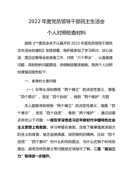 2022年度党员领导干部专题民主生活会对照检查材料(全文6794字)按照中央的统一部署和省委的通知要求,紧扣“全面贯彻习近平新时代中国特色社会主义思想,深刻领悟“两个确立”决定性意义,增强“四个意识”、坚定“四个自信”、做到“两个维护”,团结带领党员干部群众以奋发有为的精神贯彻落实党的二十大作出的重大决策部署”这一主题,认真研究,精心准备,现对照检查如下。一、存在的主要问题委领导班子对标对表中央政治局民主生活会,按照省委要求,坚持把自己摆进去、把职责摆进去、把工作摆进去,逐一对照、深入查摆,存在的问题主要有五个方面。(一)在带头深刻领悟“两个确立”的决定性意义,增强“四个意识”、坚定“四个自信...