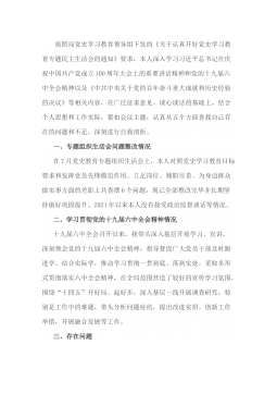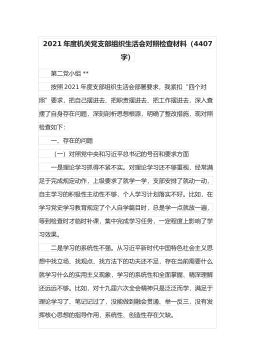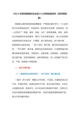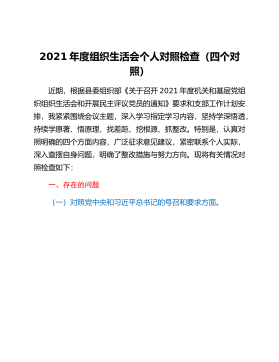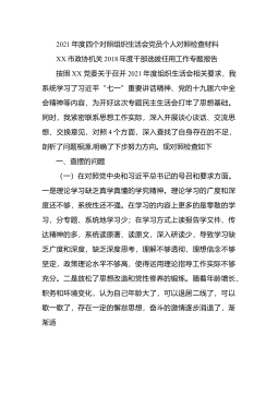 2021年度四个对照组织生活会党员个人对照检查材料XX市政协机关2018年度干部选拔任用工作专题报告按照XX党委关于召开2021年度组织生活会相关要求,我系统学习了习近平“七一”重要讲话精神、党的十九届六中全会精神等内容,为开好这次专题民主生活会打牢了思想基础。同时,我紧密联系思想工作实际,深入开展谈心谈话、交流思想、交换意见,对照4个方面,深入查找了自身存在的不足,剖析了问题根源,明确了下步努力方向。现对照检查如下一、查摆的问题(一)在对照党中央和习近平总书记的号召和要求方面。一是理论学习缺乏真学真懂的学究精神。理论学习的广度和深度还不够,系统性还不强。在学习的内容上更多的是零散的学习,分专...