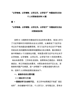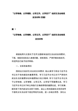 “以学铸魂、以学增智、以学正风、以学促干”组织生活会检视发言材料(四篇)篇1“以学铸魂、以学增智、以学正风、以学促干”组织生活会检视发言材料根据我局与支部关于召开主题教育组织生活会的安排要求,下面,我联系实际深入查摆问题、剖析原因、严肃开展自我批评,欢迎同志们给予批评帮助。一、会前准备情况围绕这次组织生活会的总体要求,我认真学习领会习近平总书记关于党的建设的重要思想,学习习近平总书记关于严肃党内政治生活的重要讲话和重要指示批示精神,学习习近平总书记关于以学铸魂、以学增智、以学正风、以学促干等重要论述,学习习近平总书记关于树立和践行正确政绩观的重要论述,学习党章、新形势下党内政治生活若干准则、县...
